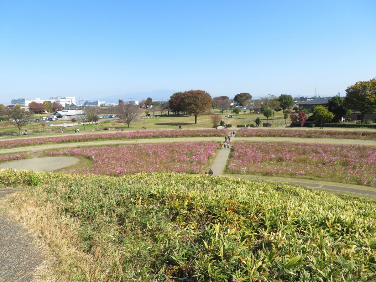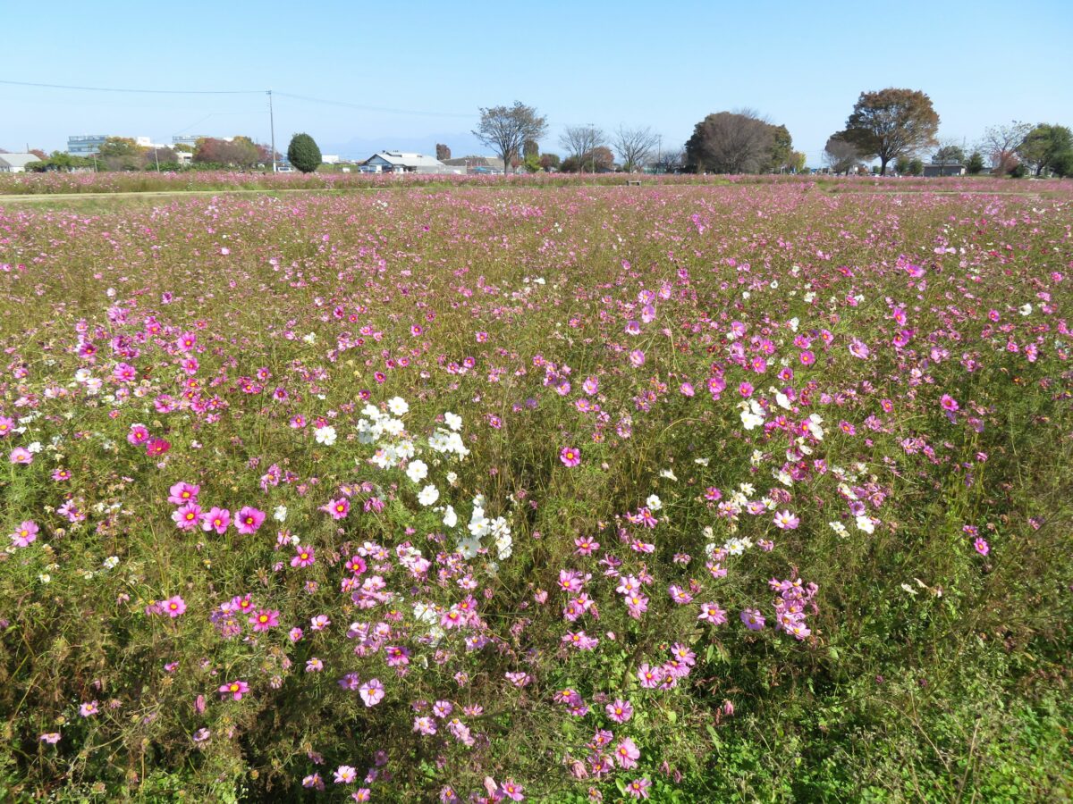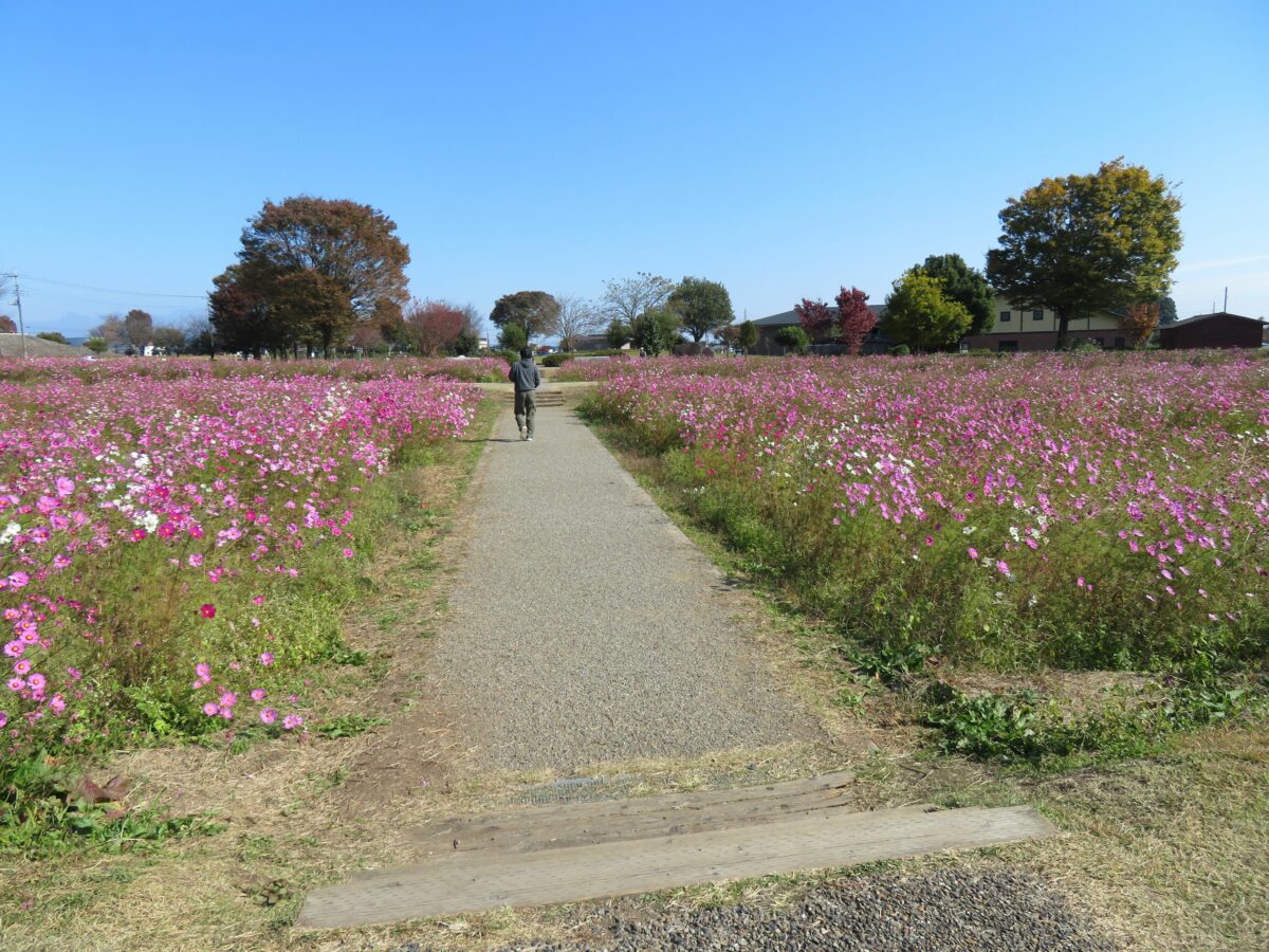 高崎市北部の「はにわの里」には、古墳時代の2つの前方後円墳が復元整備されています。「八幡塚古墳」の南側の「二子山古墳」では、全周を囲むようにコスモスが植栽されます。例年9月下旬から11月上旬にかけて季節の彩りで古墳に眠る古代の豪族の霊を慰めているようです。
