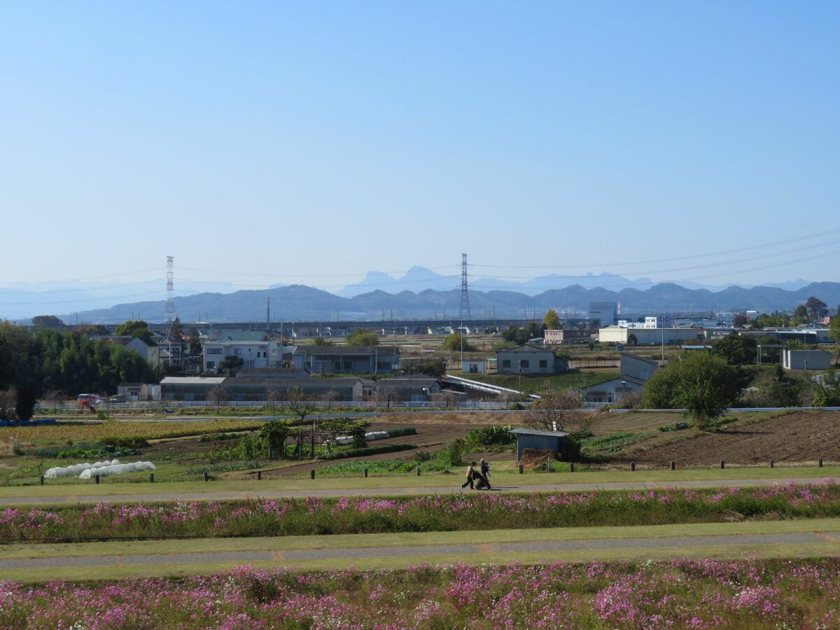 コスモス畑から視線を上げると、上州の山々を眺めることができます。