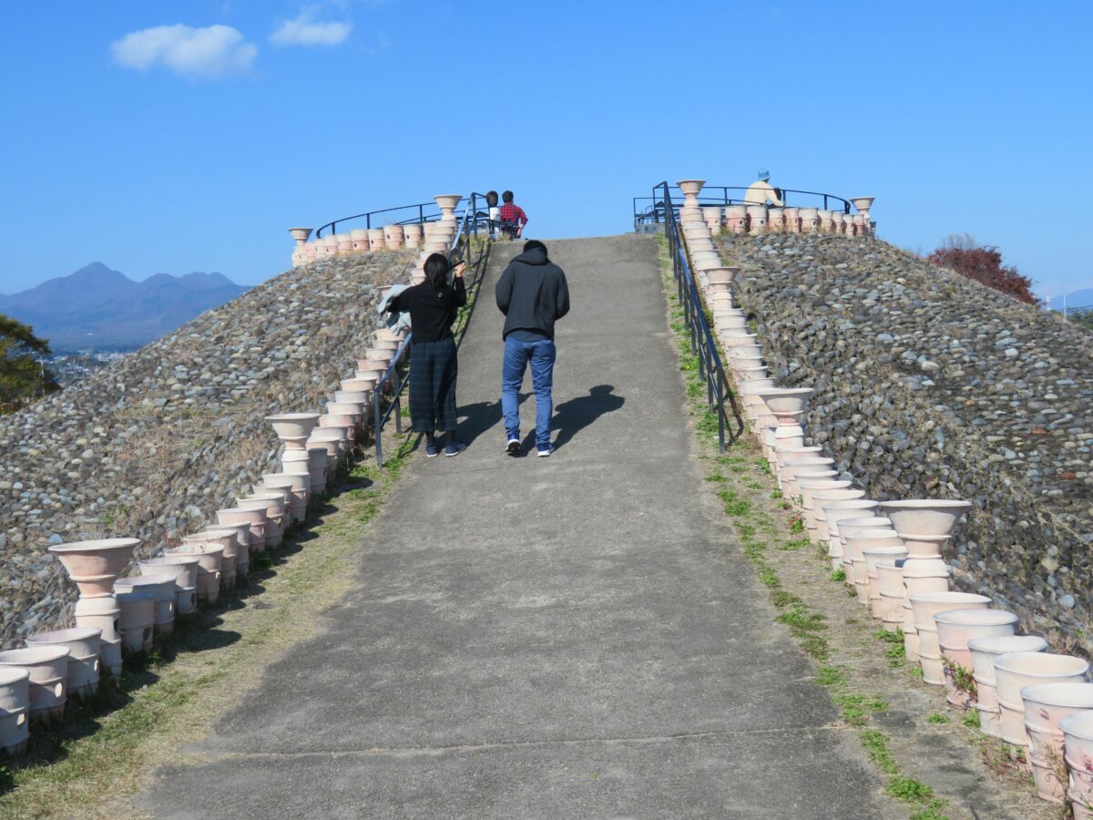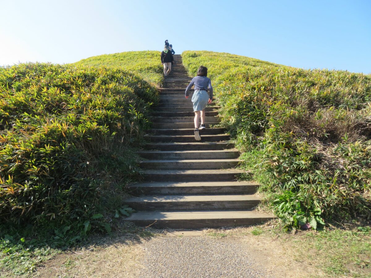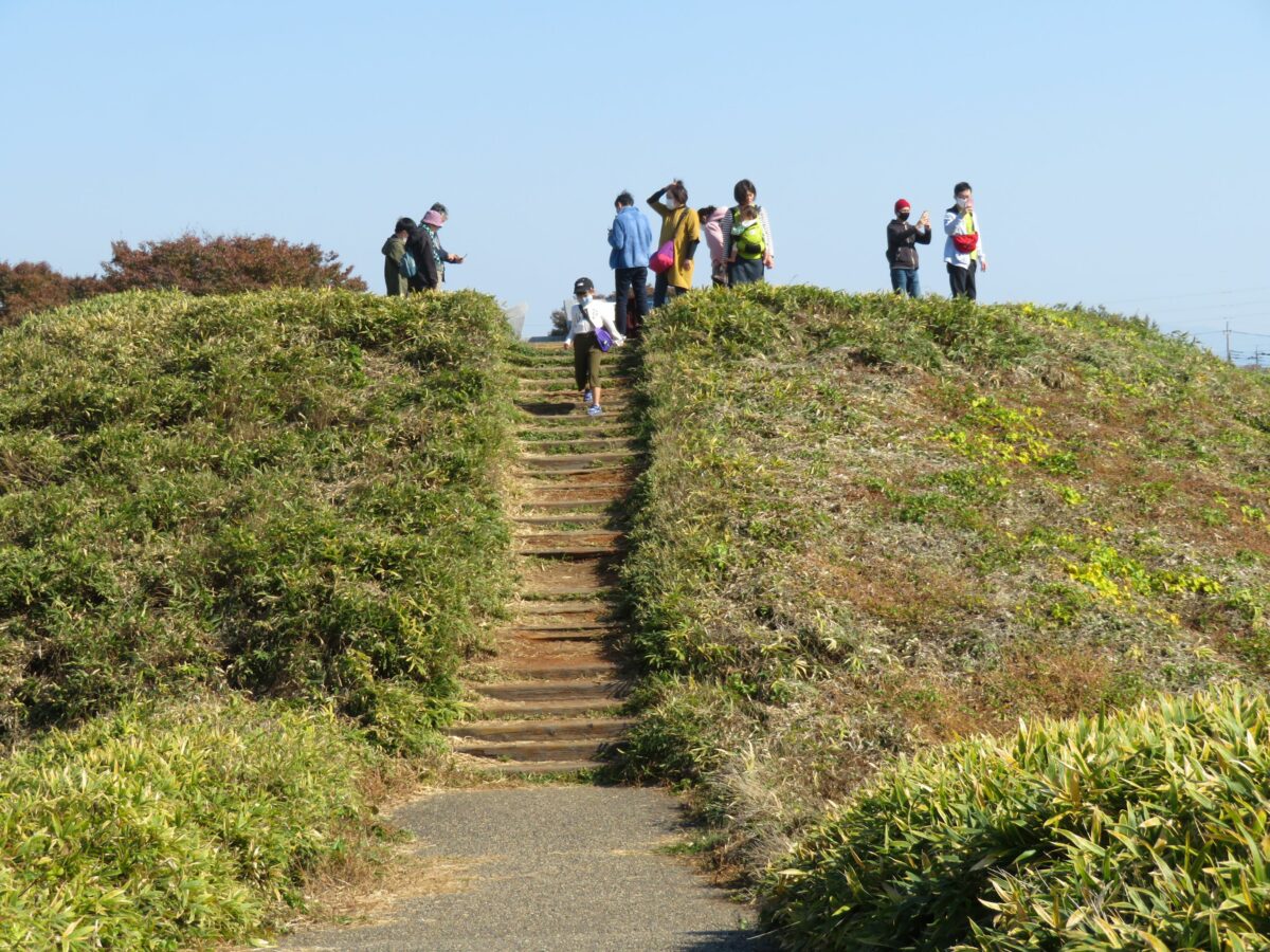 「二子山古墳」の墳丘には、東側、北川の階段を利用して上ることができます。