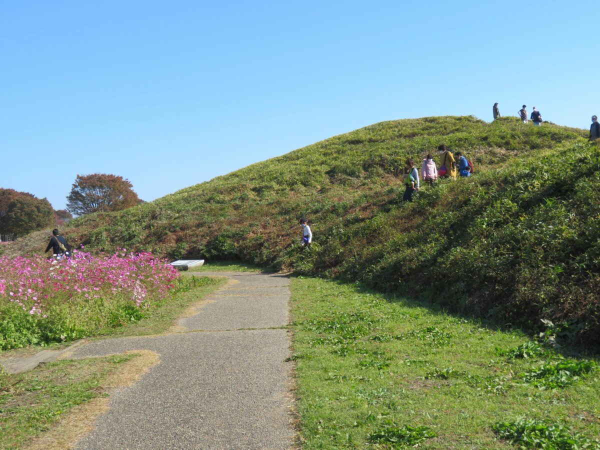 例年コスモスが植えられるのは、「二子山古墳」の内堀、外堀です。墳丘の全周がコスモスの花で彩られ、古墳に眠る古代の豪族の霊を慰めているかのようです。