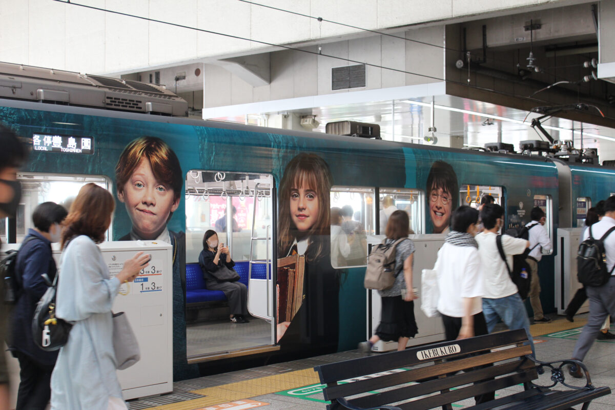 最寄の西武鉄道・豊島園駅へ向かう鉄道は、お馴染みのハリー、ハーマイオニー、ロンのラッピングが施され、期待が高まります。始発の池袋駅ホームも、キングスクロス駅風の装いに!