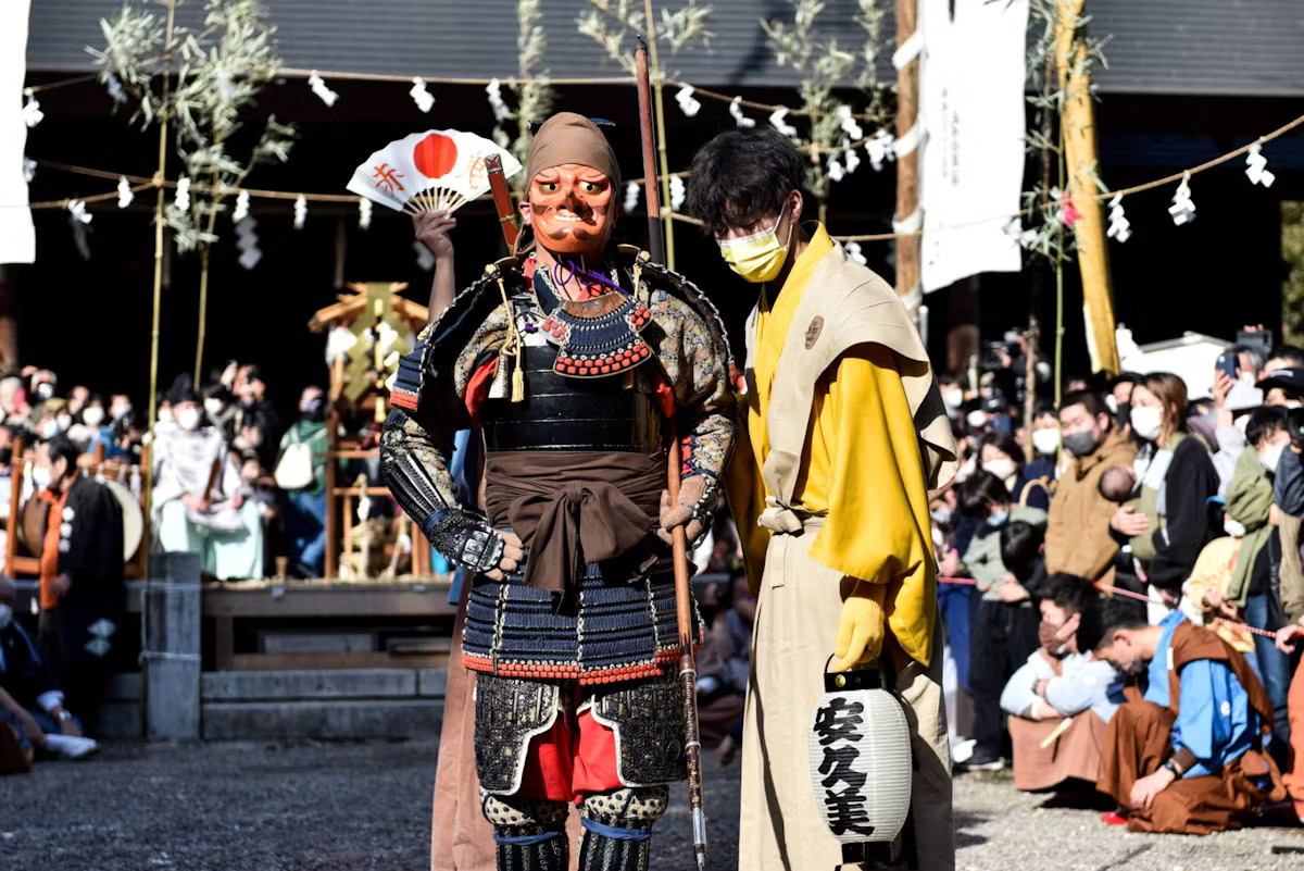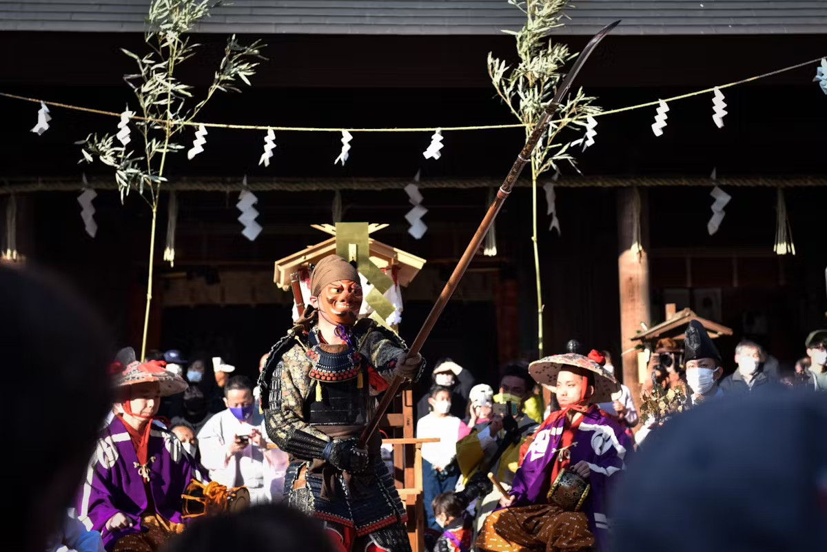 本祭では御神楽、田楽、年占い、御神幸などさまざまな神事が行われますが、中でも有名なのが「赤鬼と天狗のからかい」という神事。五穀豊穣、無病息災などさまざまな願いを込めて行われる神事であり、荒ぶる神である赤鬼のイタズラを、武神である天狗が赤鬼を懲らしめようとするストーリー。どこかユーモラスなやり取りが見る人を魅了します。