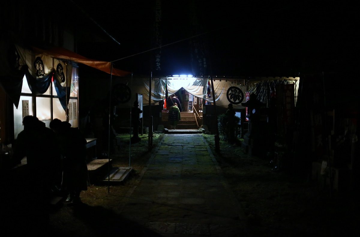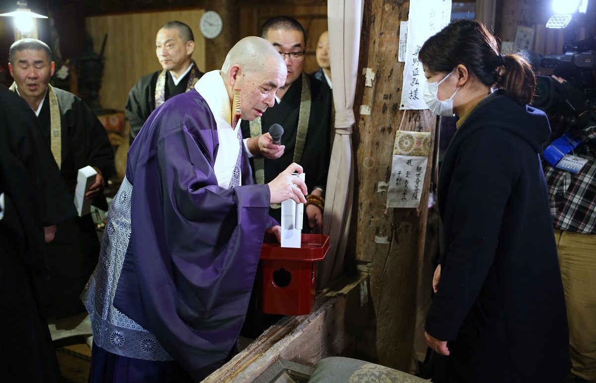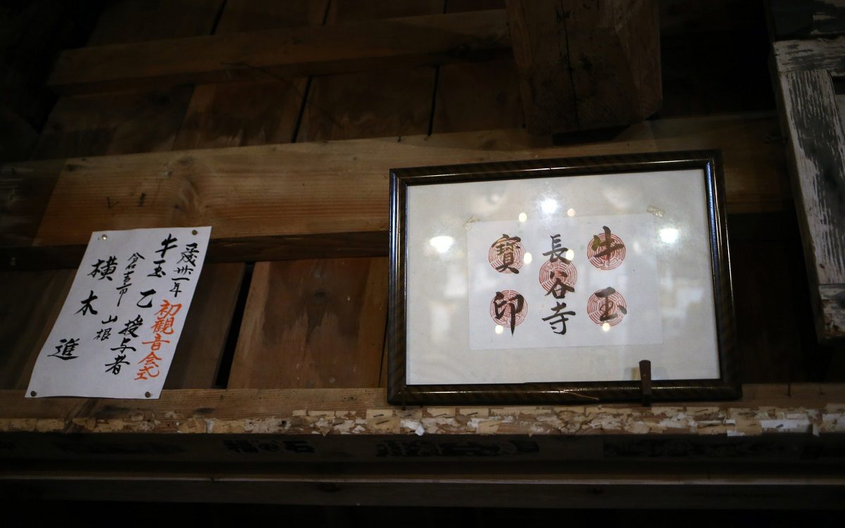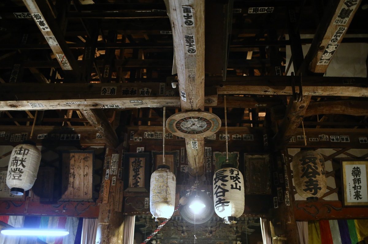 運動不足の私には厳しい山を登り、案内看板で予定を確認しました。「打吹山長谷寺縁日、初観音会式」と書いてありました。20時半から護摩供法要第一座、21時半から福牛玉法要、22時から福木授与(牛玉授け)と静かな中はじまりました。入る前にはお寺の鐘を鳴らさせてもらいました。静寂を切り裂いて響いてました。