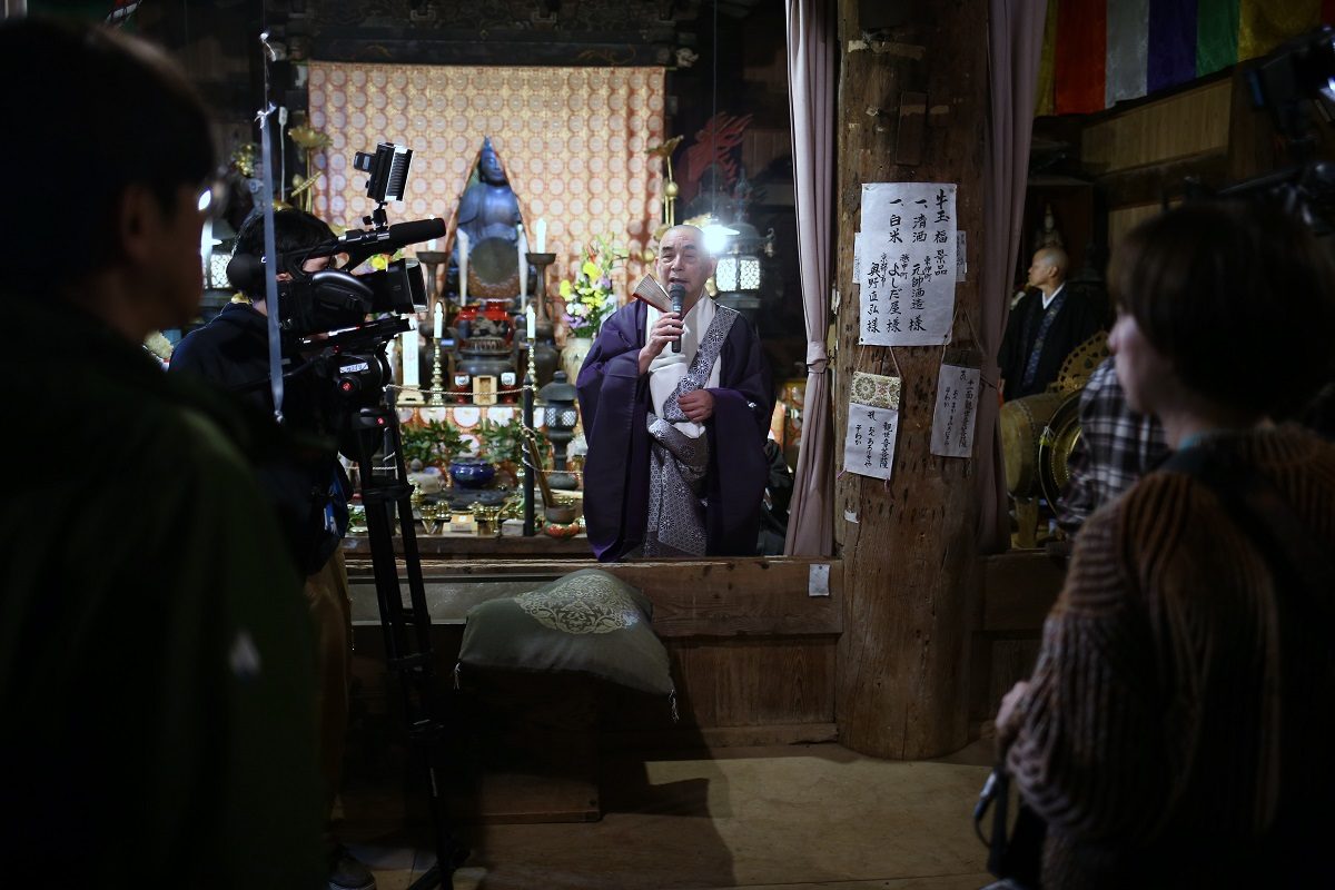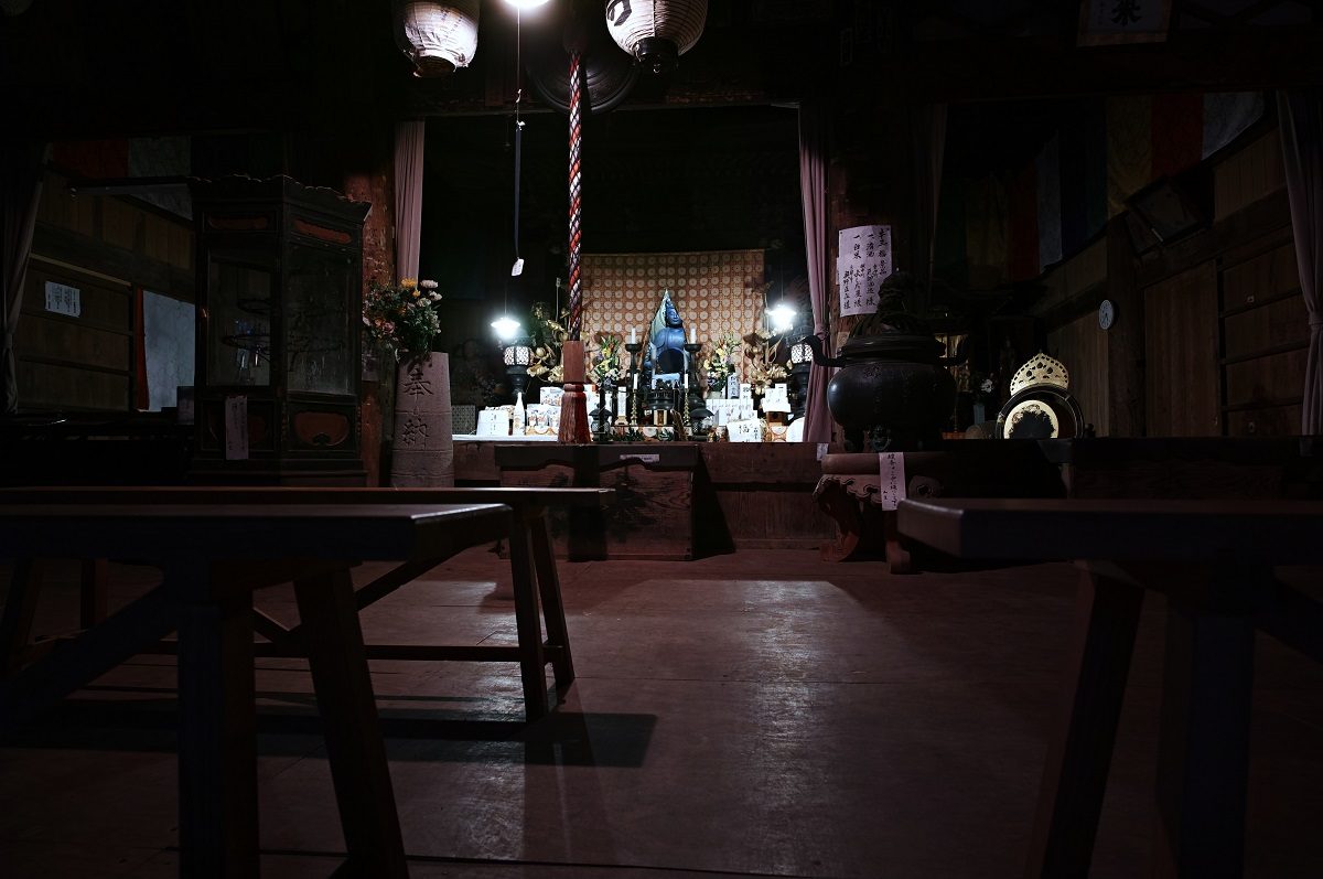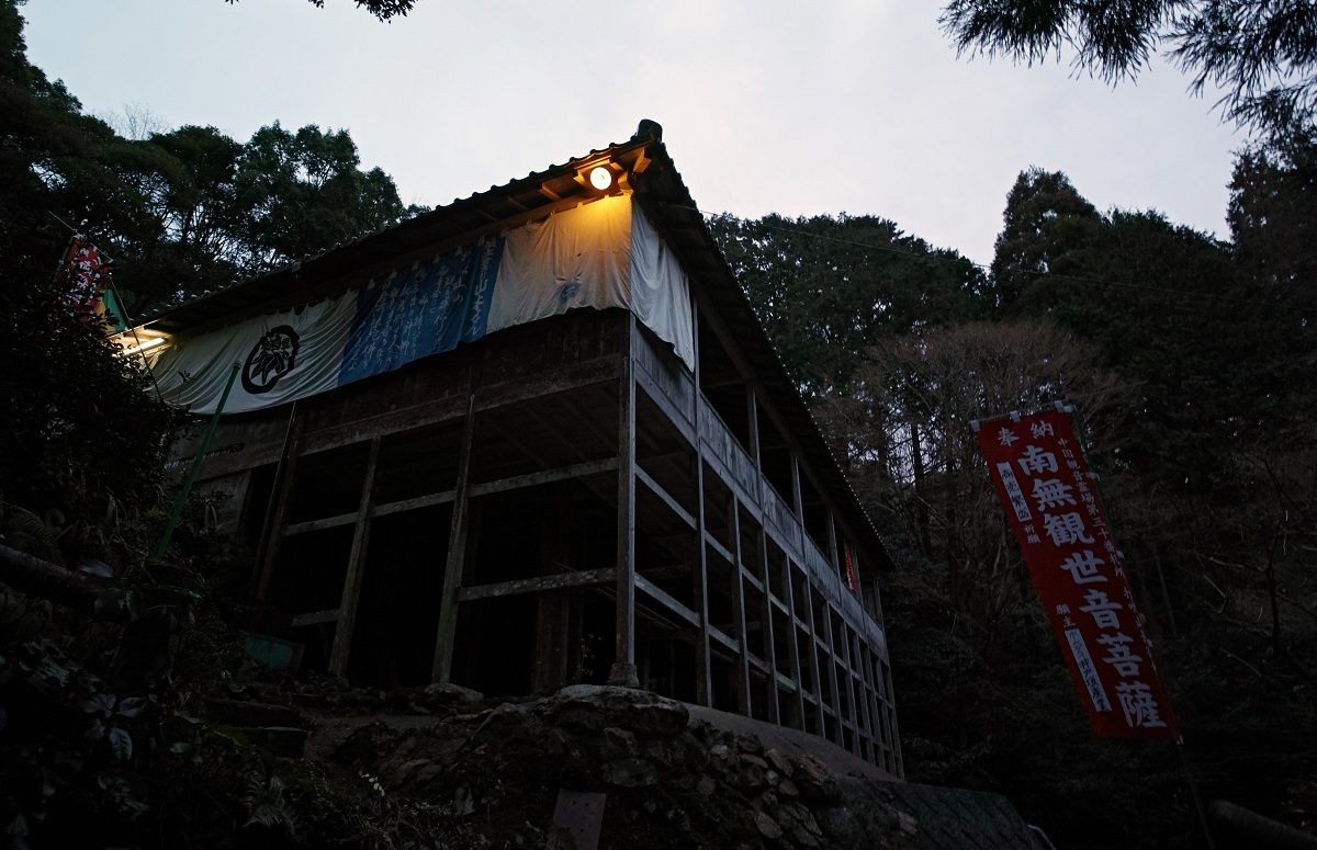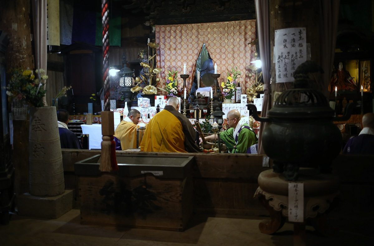 運動不足の私には厳しい山を登り、案内看板で予定を確認しました。「打吹山長谷寺縁日、初観音会式」と書いてありました。20時半から護摩供法要第一座、21時半から福牛玉法要、22時から福木授与(牛玉授け)と静かな中はじまりました。入る前にはお寺の鐘を鳴らさせてもらいました。静寂を切り裂いて響いてました。