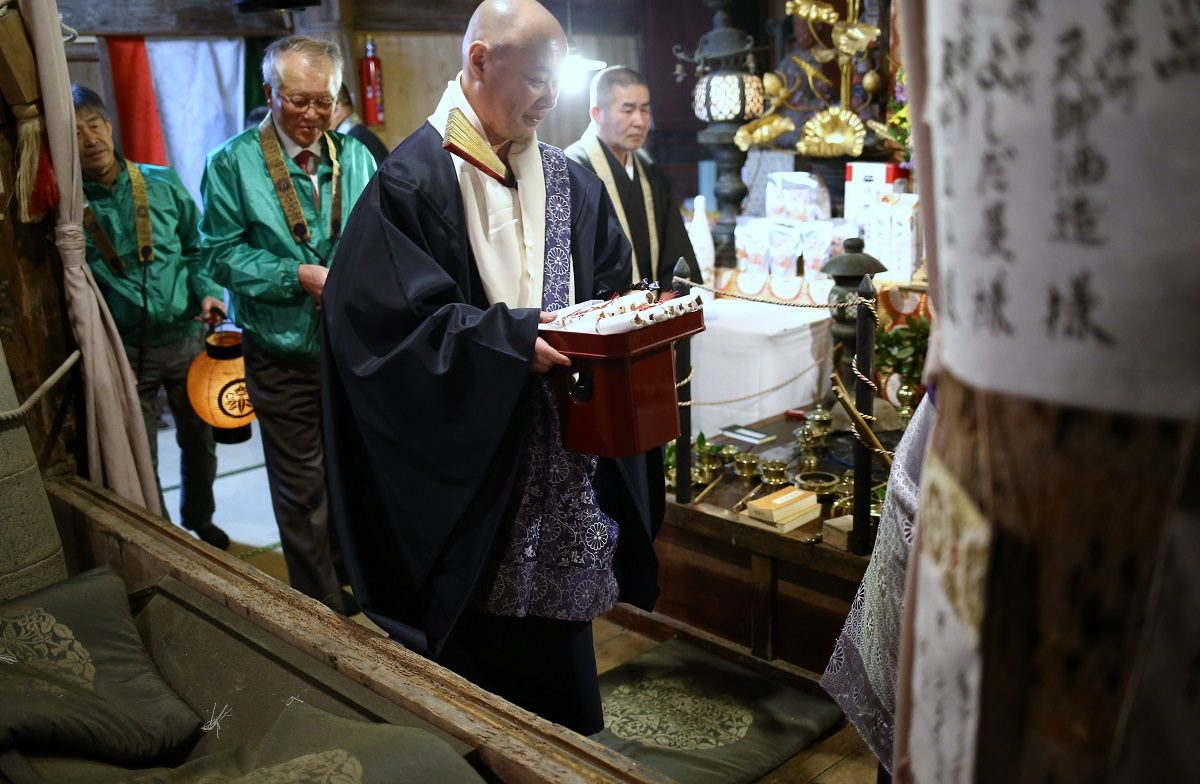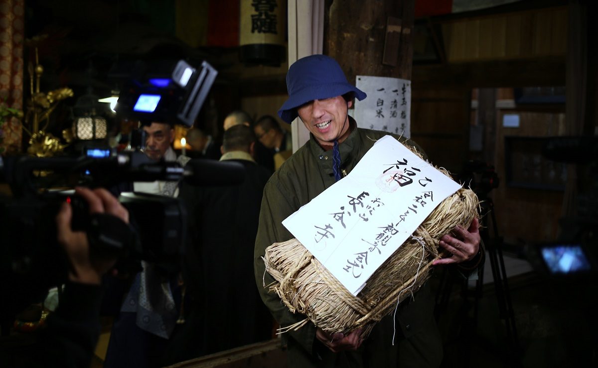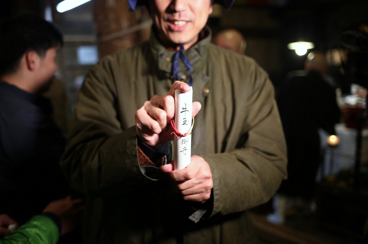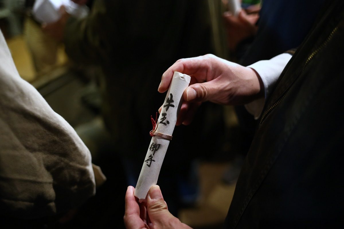 今年は閏年で、13本の牛玉宝印を記した福木を奪い合います。平年は12本なので、1回チャンスが増える年です。福木を頂くと、商売繁盛・五穀豊穣・家内安全など新しい1年の福を授けてくれるといわれる伝統行事です。