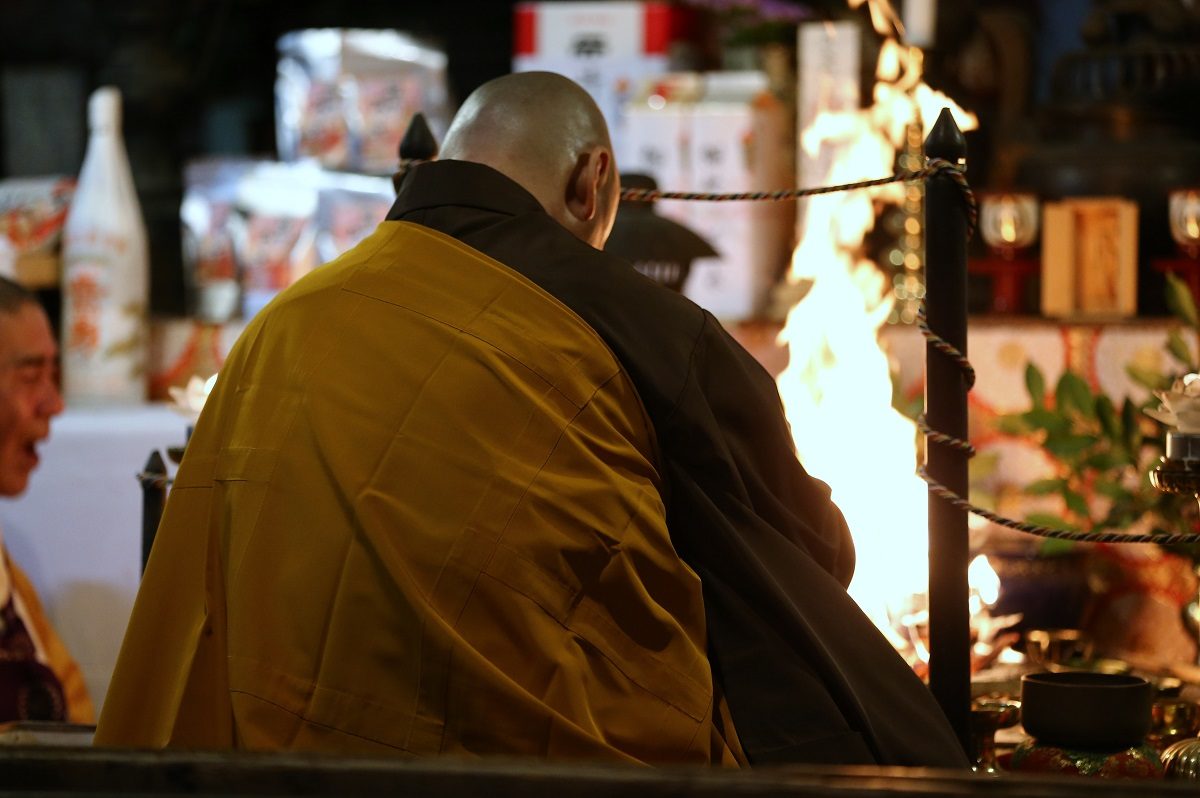20時半から護摩供法要第一座、地域の方や檀家さんに交じって観察していきます。本尊左右の「福」が福木を頂いた方々がいただくお供え物ですね。