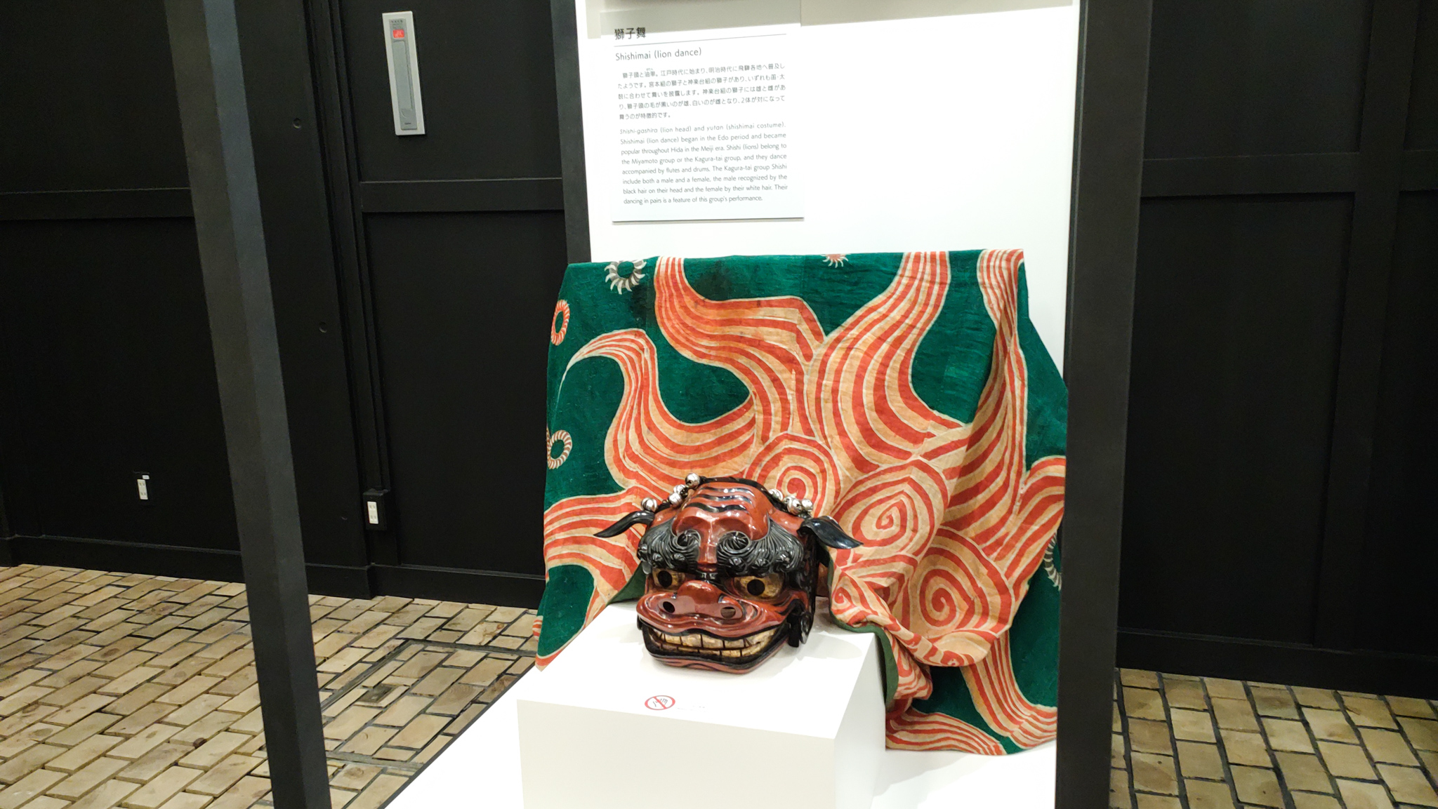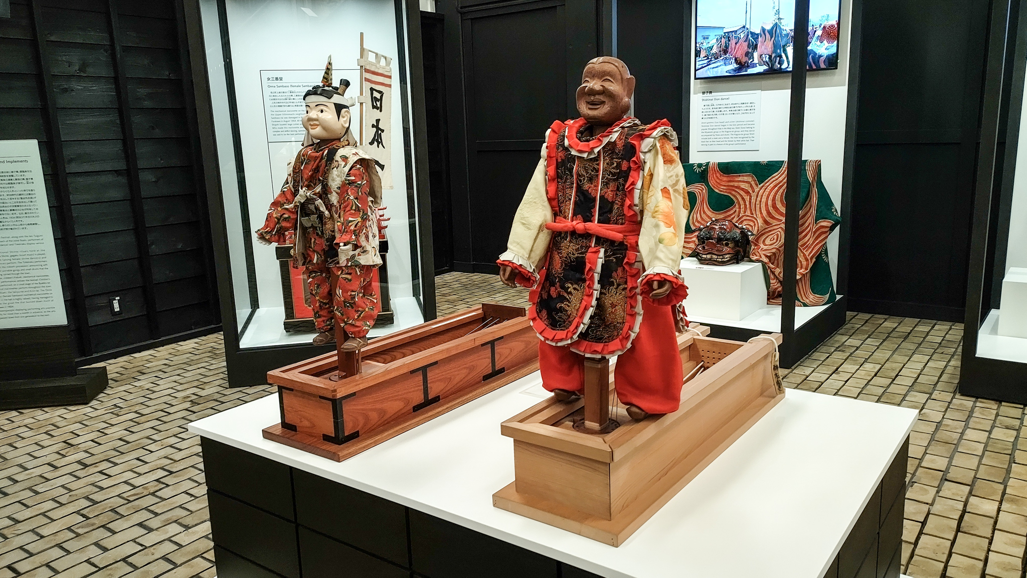 からくり人形に関しては、実際に紐を引っ張って左右に動かす操作体験ができるようになっている。また、その背後には油単(ゆたん)の胴体を持つ獅子舞や、闘鶏楽、義経と弁慶の子供歌舞伎などの展示もある。獅子舞については、個人的には幌とカヤのものばかり見てきたので、油単(ゆたん)がとても新鮮だった。