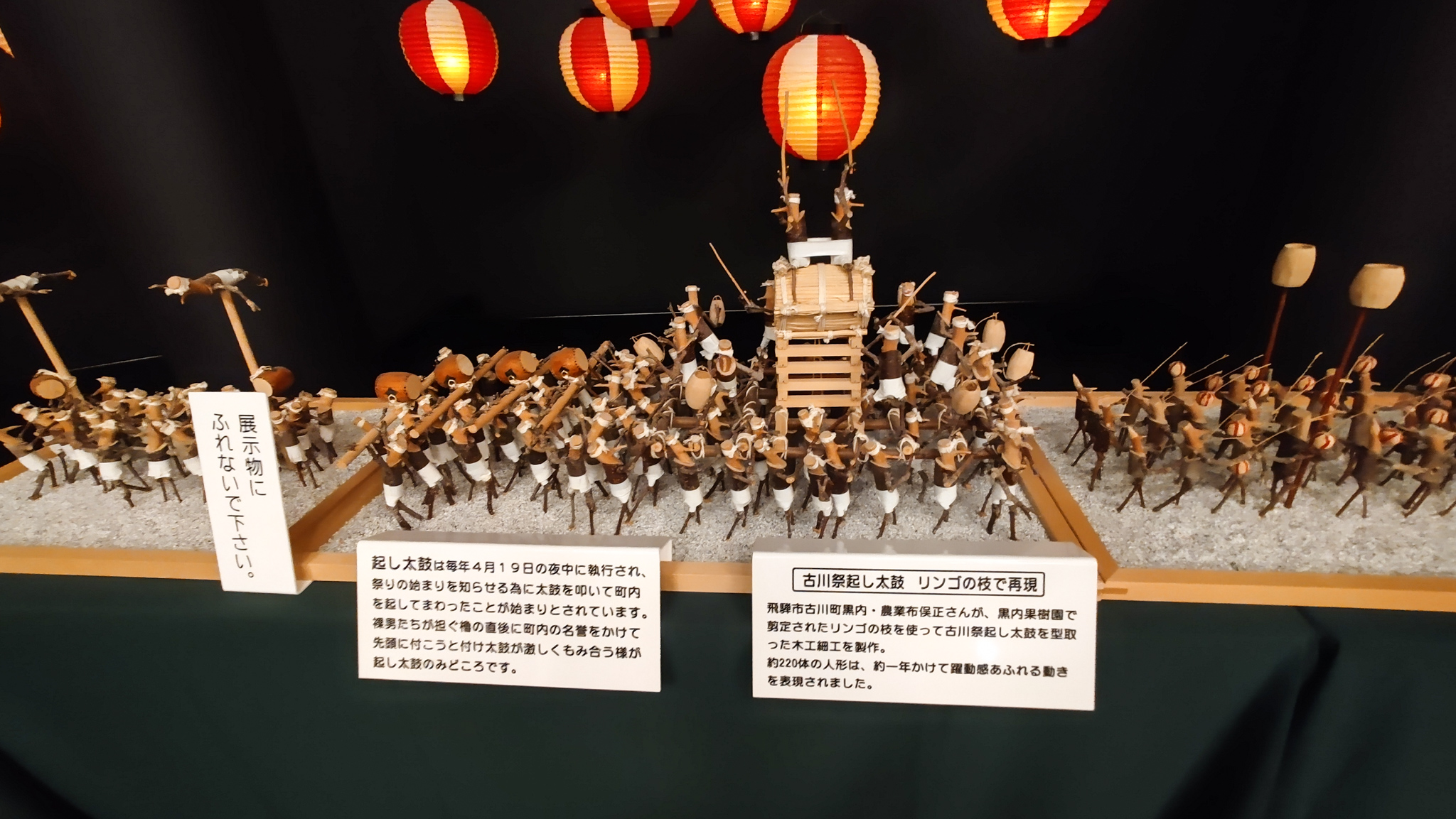 それから、古川祭の見どころの一つである起こし太鼓のレプリカと、その行列を再現した展示がある。「付け太鼓」の棒の上で行われる「とんぼ」という曲芸を実際に体験できるコーナーもある。先ほどのからくり人形含め、実際に臨場感あるれる展示とともに古川祭の様子を体験できることがこの飛騨古川まつり会館の面白さだろう。