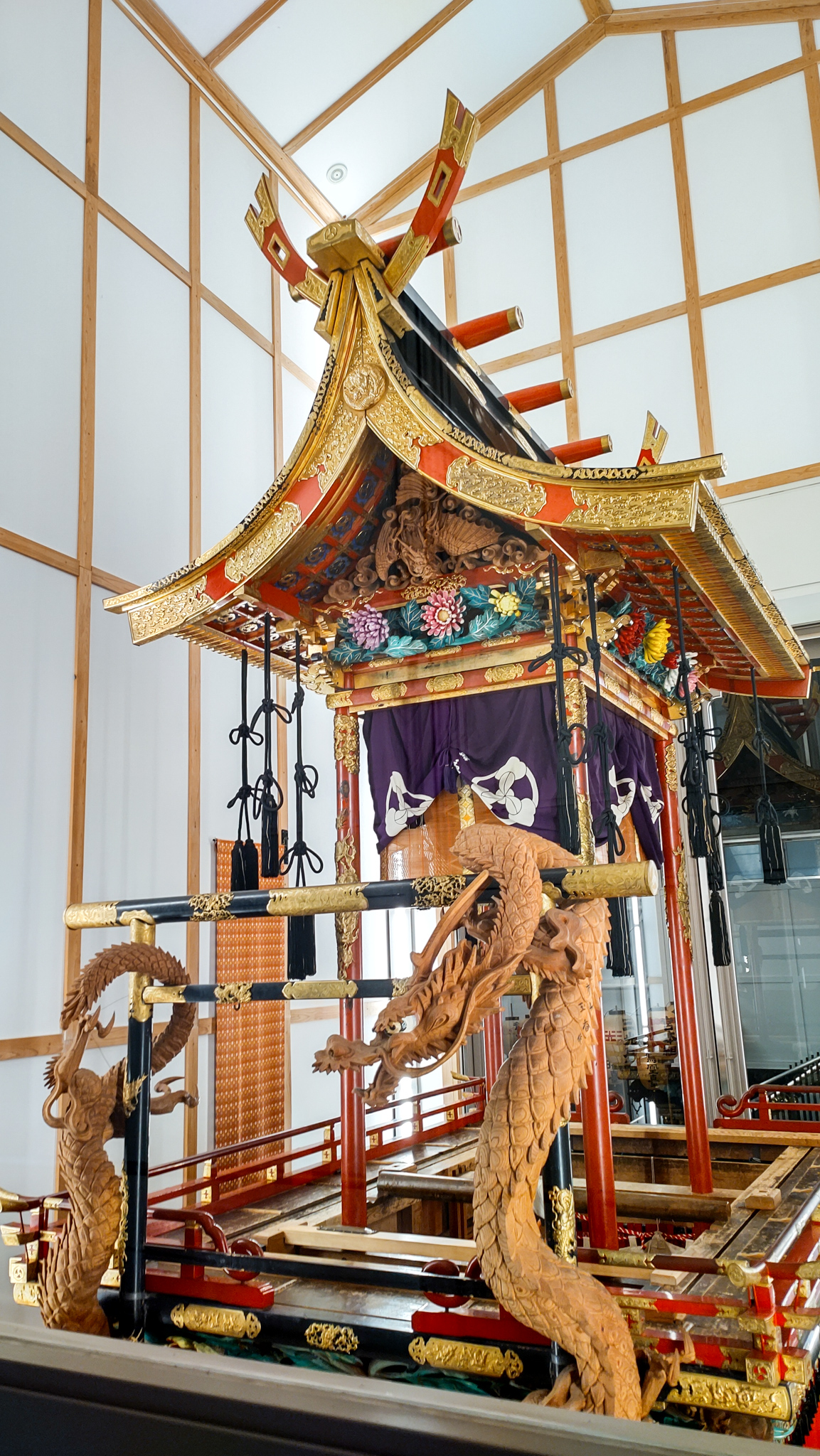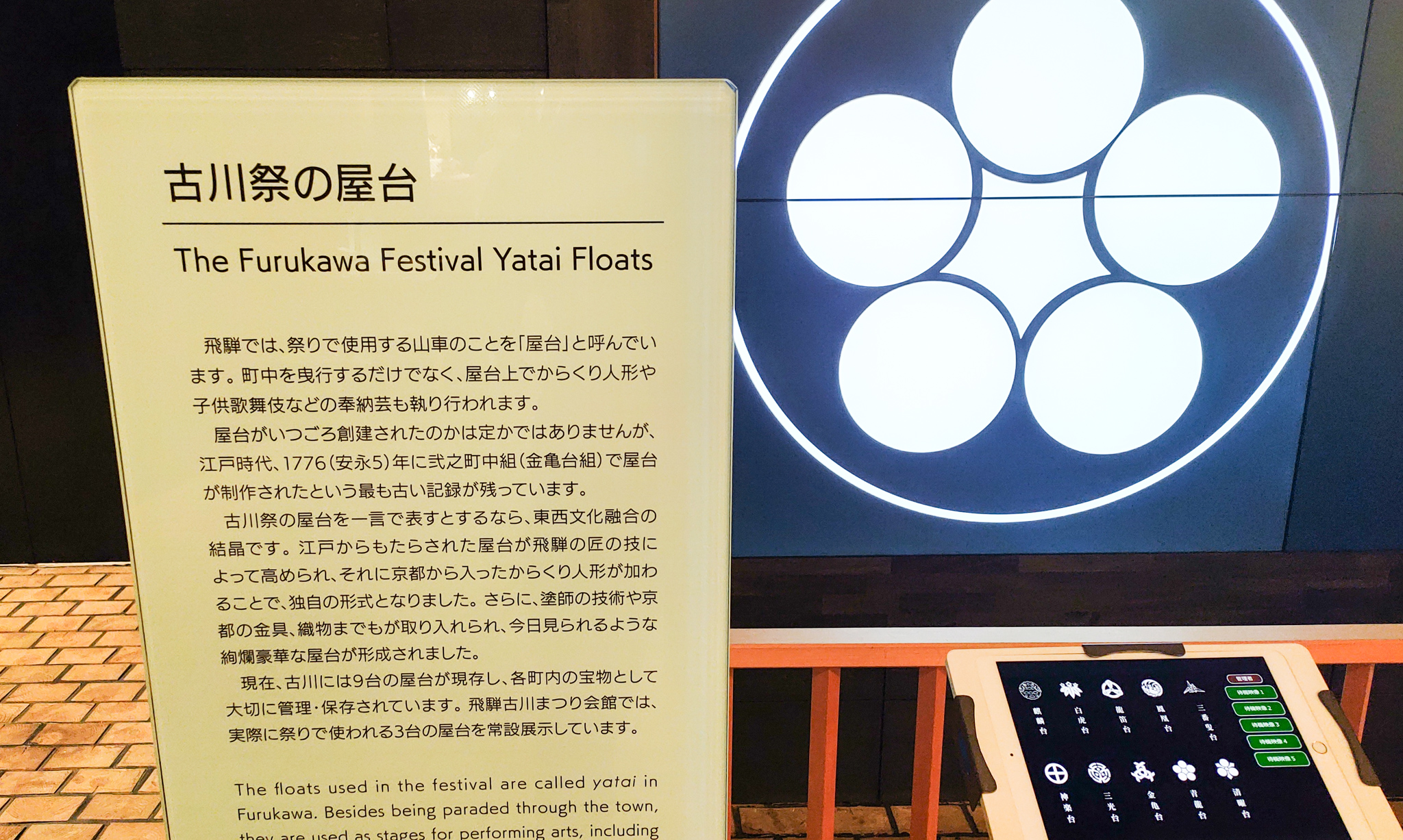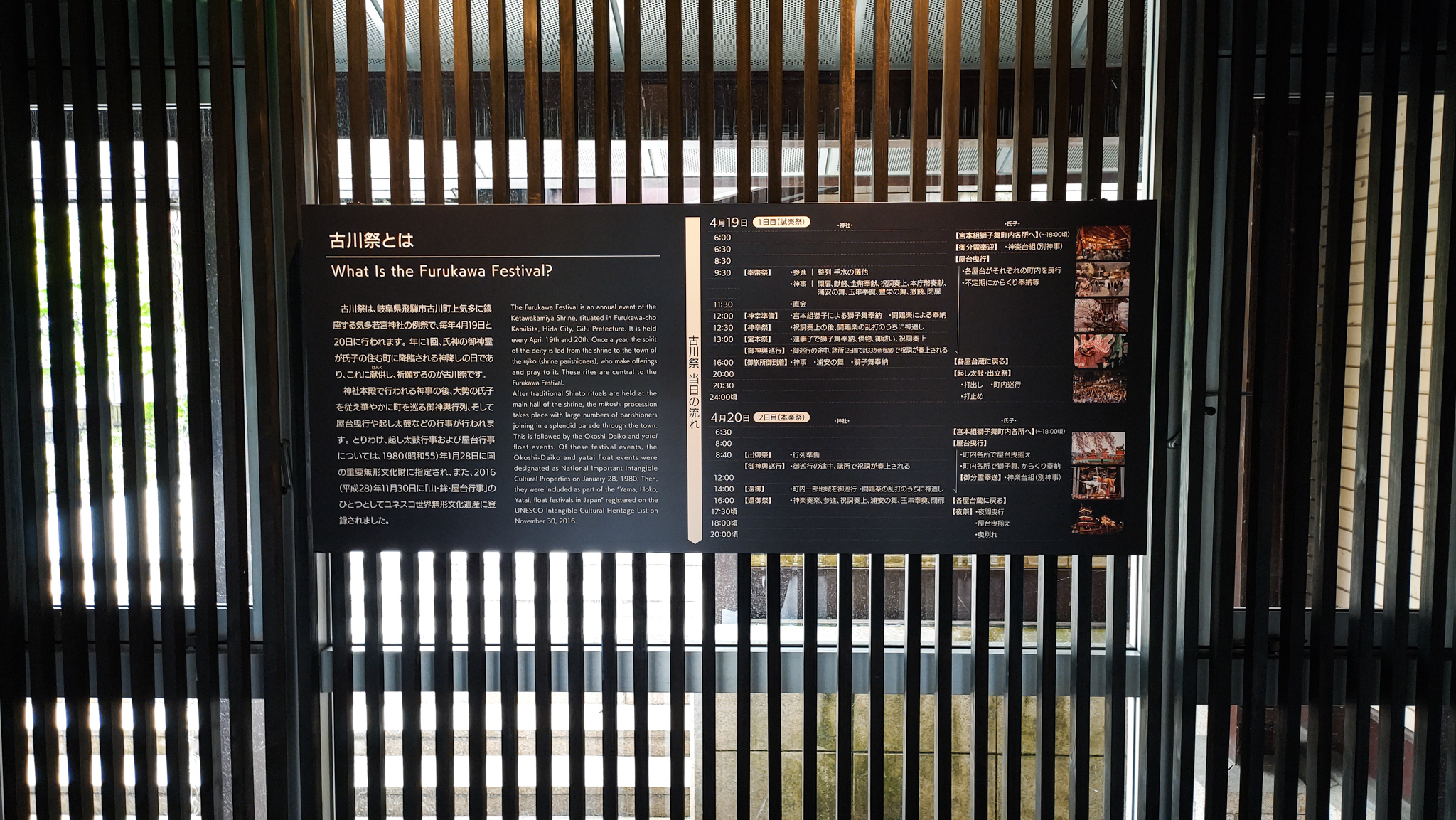 古川祭では実際に10台の屋台が使われるが、そのうち3つの屋台が常時展示されている。定期的に入れ替えをするようだが、どれも人間の背丈をはるかに超える圧巻の大きさだ。そして、伝統工芸の飾りや彫り物の美しさと細かさがとても際立っている。自動で回転しているものもあり、展示場の工夫もされていた。この大きな屋台が実際に街を練り歩いているという姿を想像すると、迫力のある雰囲気が想像できる。古川祭当日には、この屋台に子供達が上がって、からくり人形や子供歌舞伎などを演じるようだ。