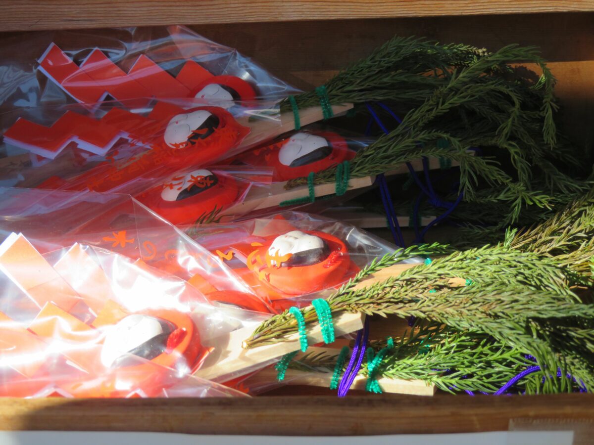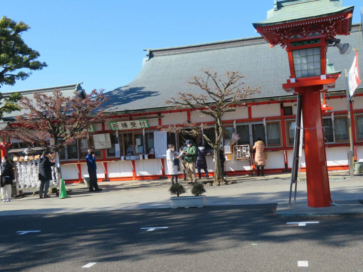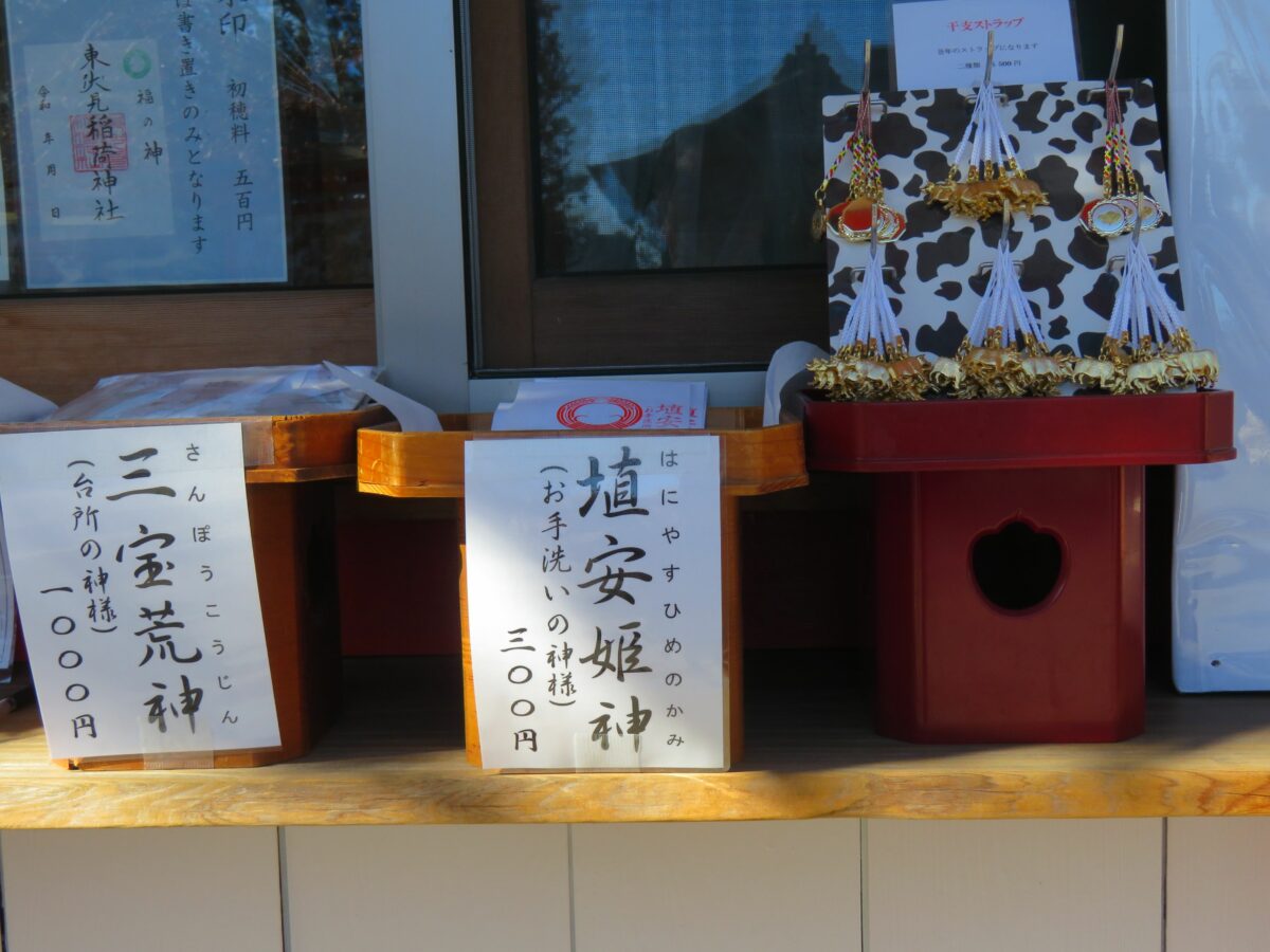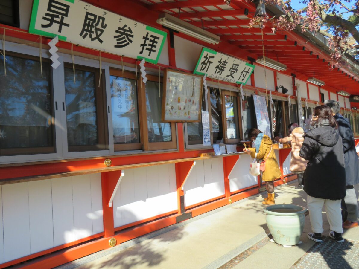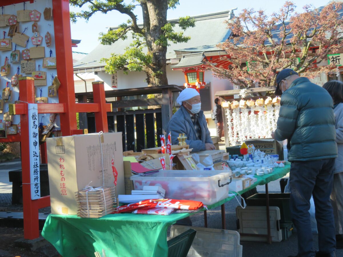 拝殿西の祈祷受付では、稲荷山の杉やお多福の面などを組合せた縁起物の「しるしの杉」などの授与を受けることができ、境内には露店も出店されます。