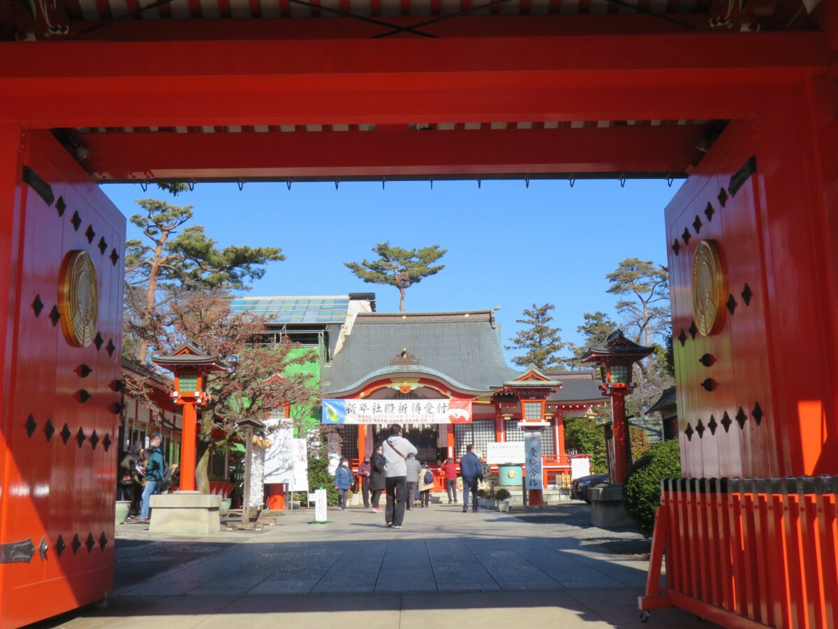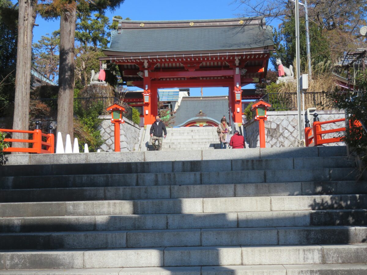 神社の玄関には朱色の鳥居が立ち、白色の石階段で神門と繋がります。