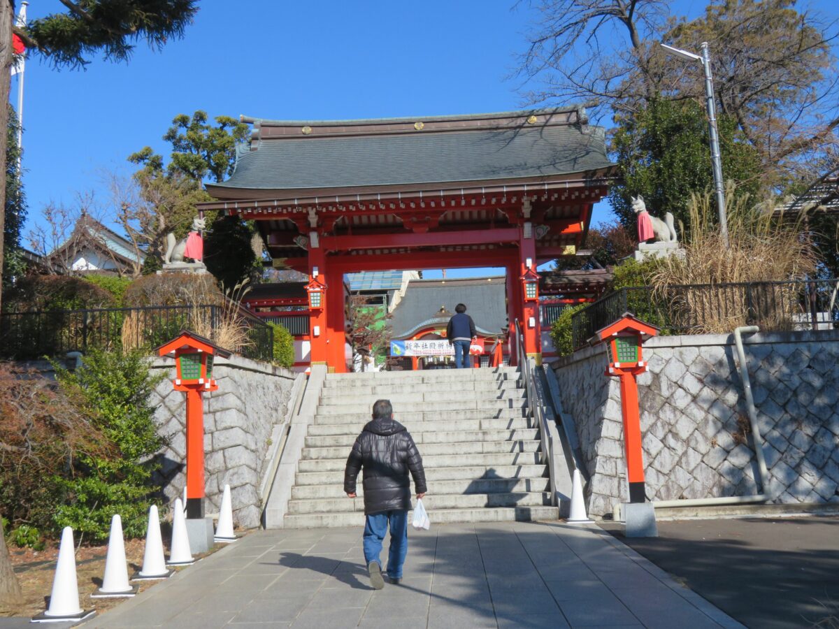 中央に拝殿を構える境内の入口では、朱色の神門が青空と色彩のコントラストを見せています。門の左右には稲荷大神のお使いとされる狐が参拝者を出迎えてくれます。