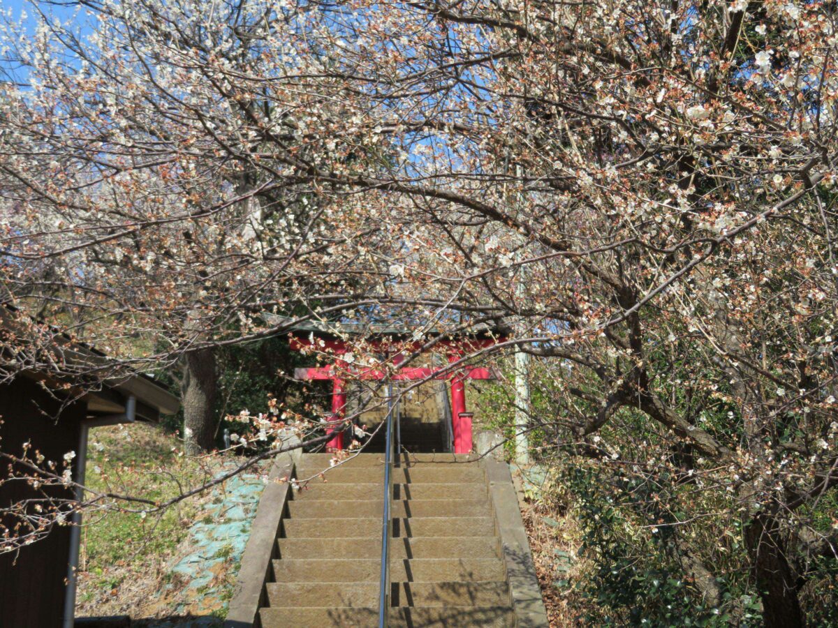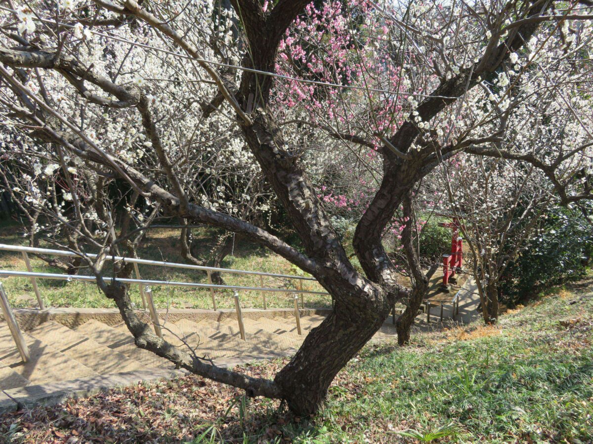 境内と神社の正門となる鳥居を結ぶ石階段の左右も梅の花が覆っています。