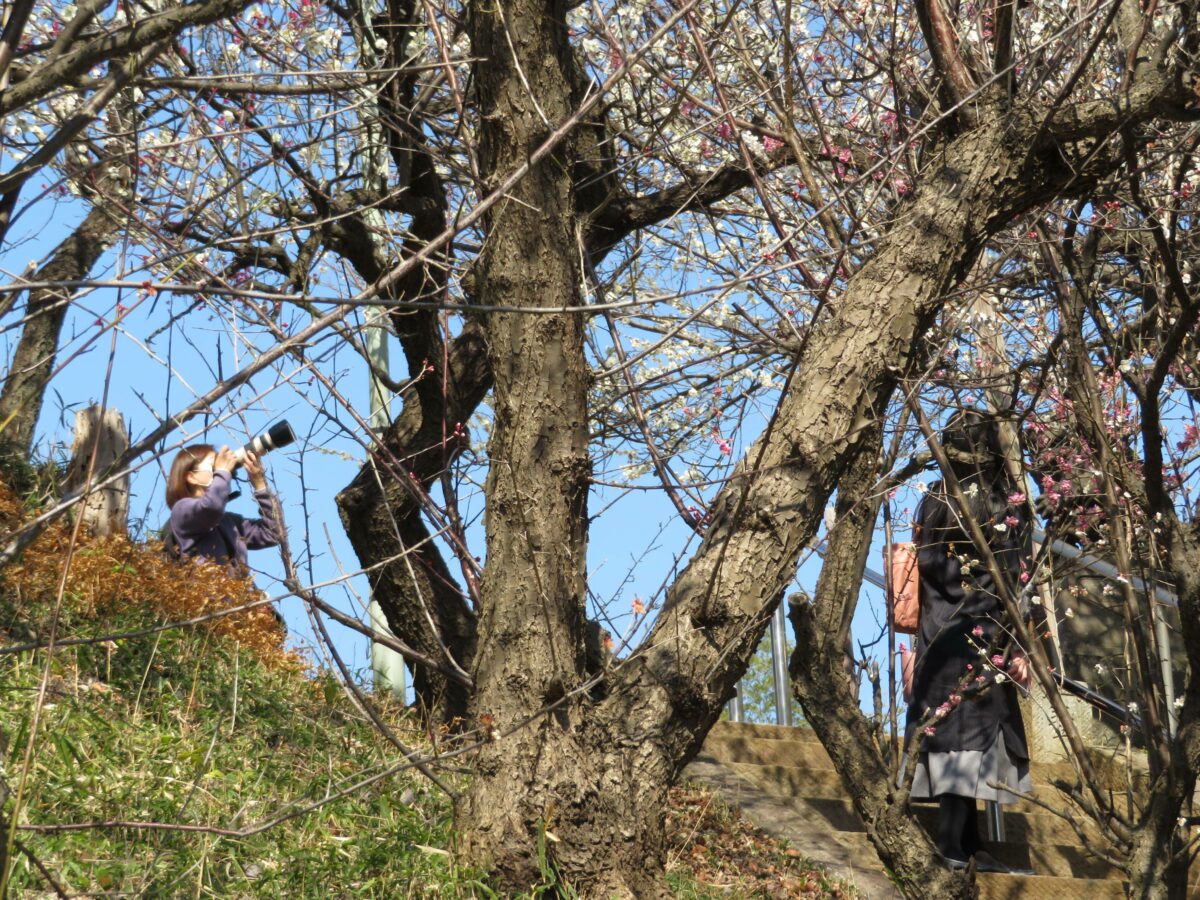境内と鳥居を結ぶ石階段の最上部で梅に向かってカメラを向ける写真愛好家