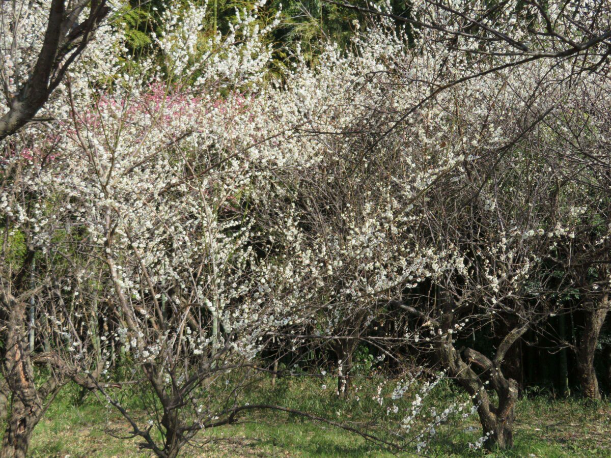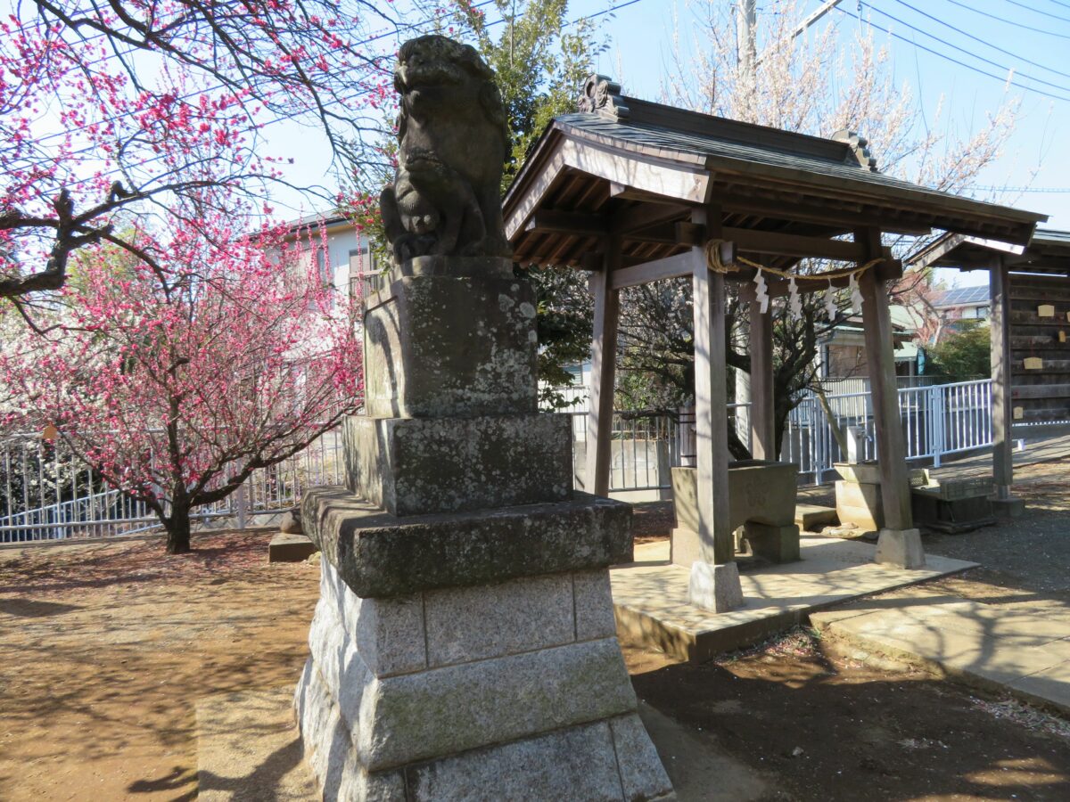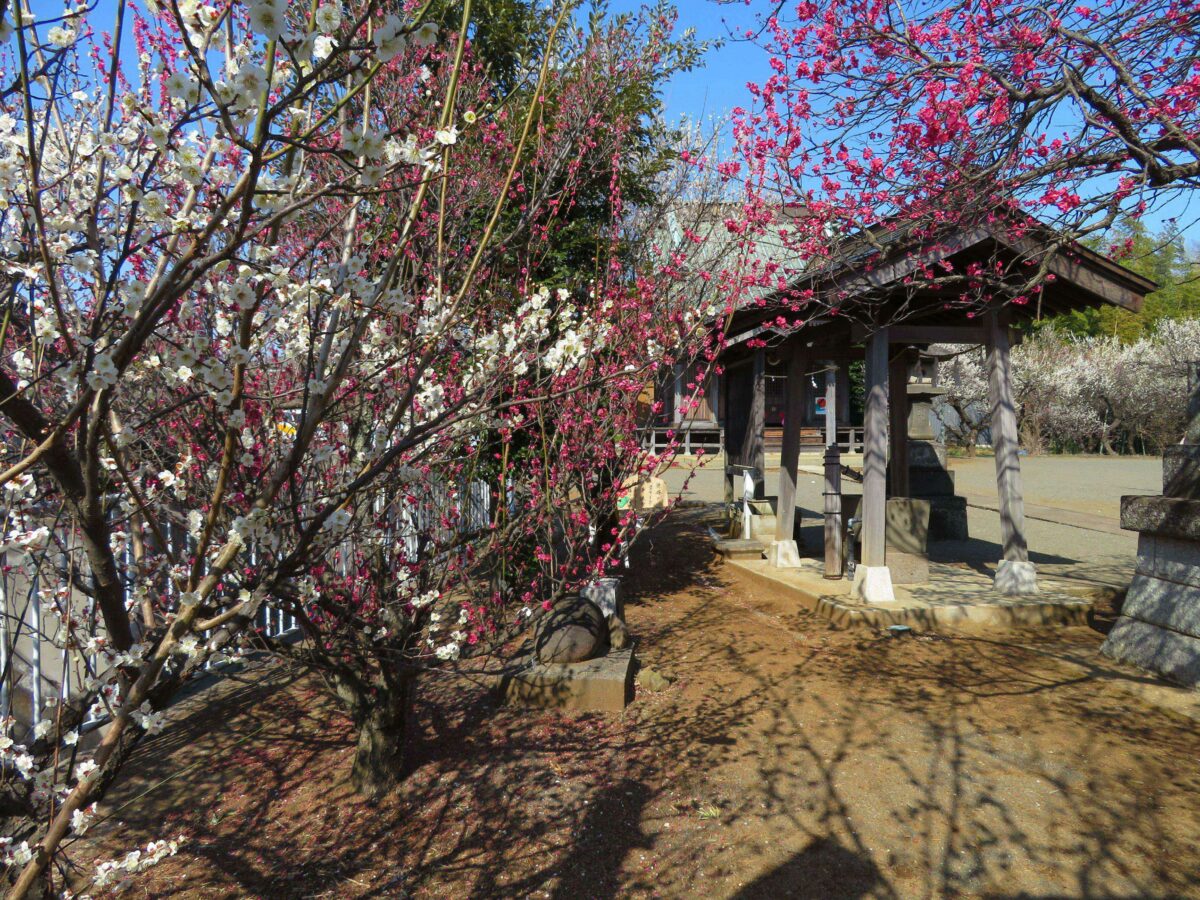 横浜市都筑区に社殿を構える東方天満宮の境内は四方を梅林が取り囲み、例年2月下旬には早春の彩りで包まれます。手水舎や狛犬が設置される境内の南西のエリアは、紅梅と白梅が絶妙のバランスで溶け合います。