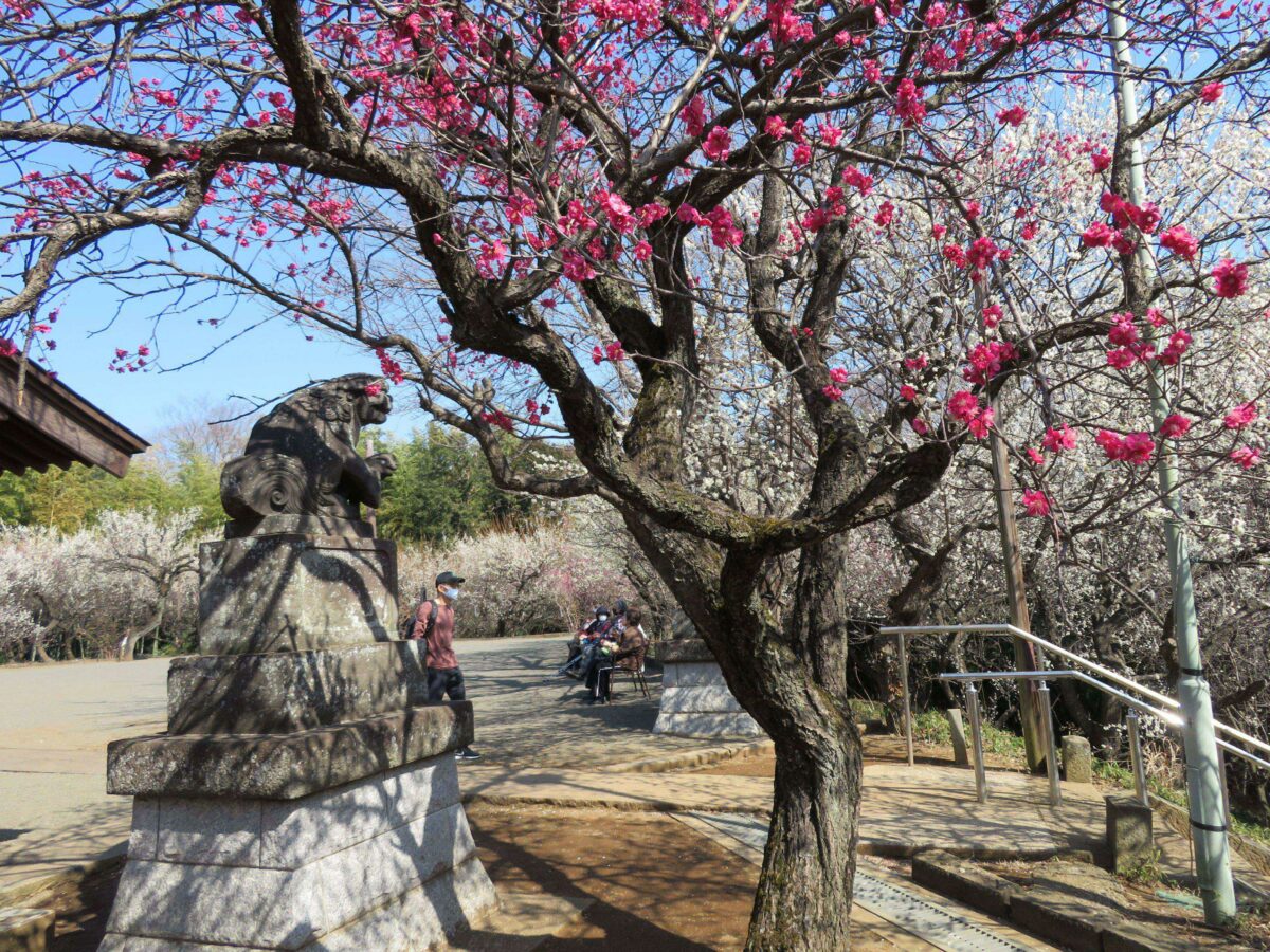 東方天満宮の境内の南西には手水舎や狛犬が設置され、紅梅と白梅がバランスよく溶け合っています。