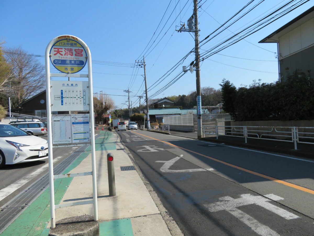 神社の鳥居の西数十メートルのところに市営バスの「天満宮」停が設置され、横浜市営地下鉄の仲町台駅や、センター南にアクセスすることができます。