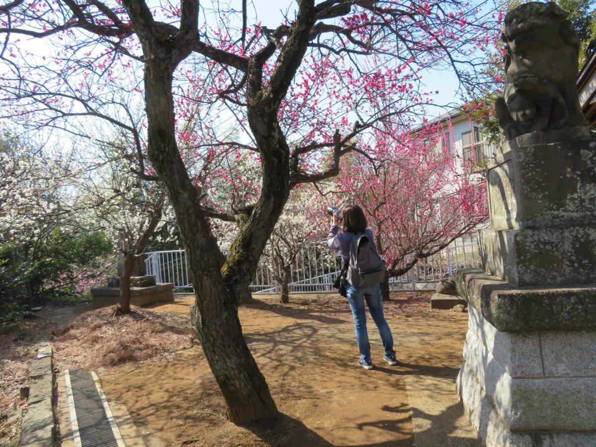 狛犬の袂で梅に向かってカメラを向ける写真愛好家