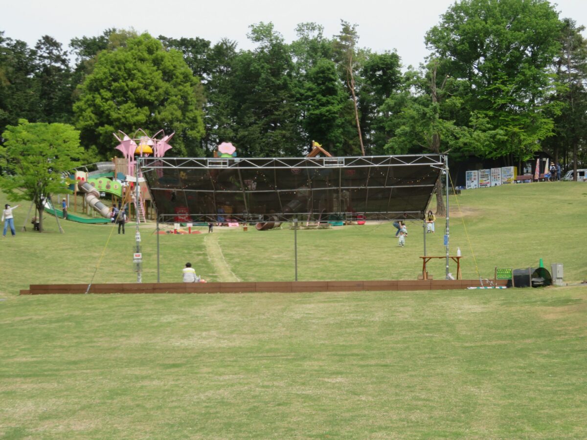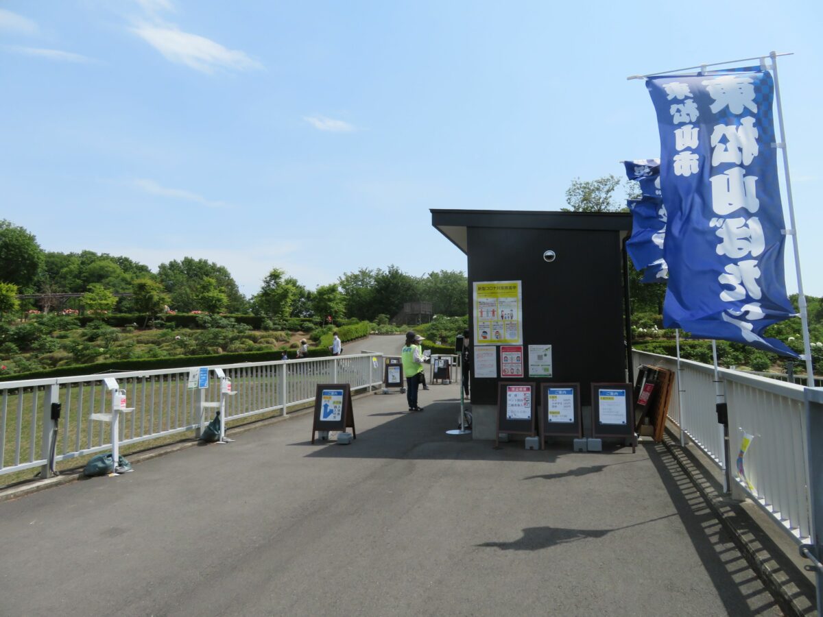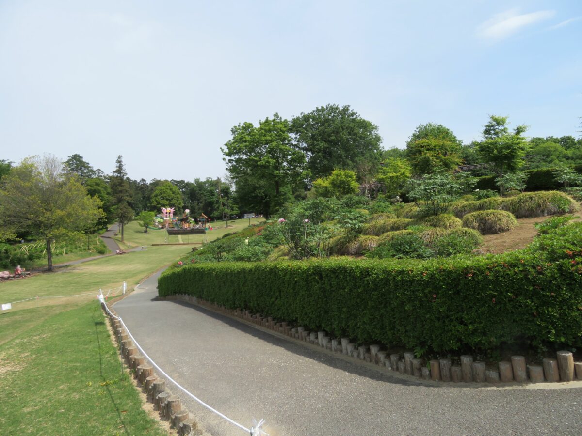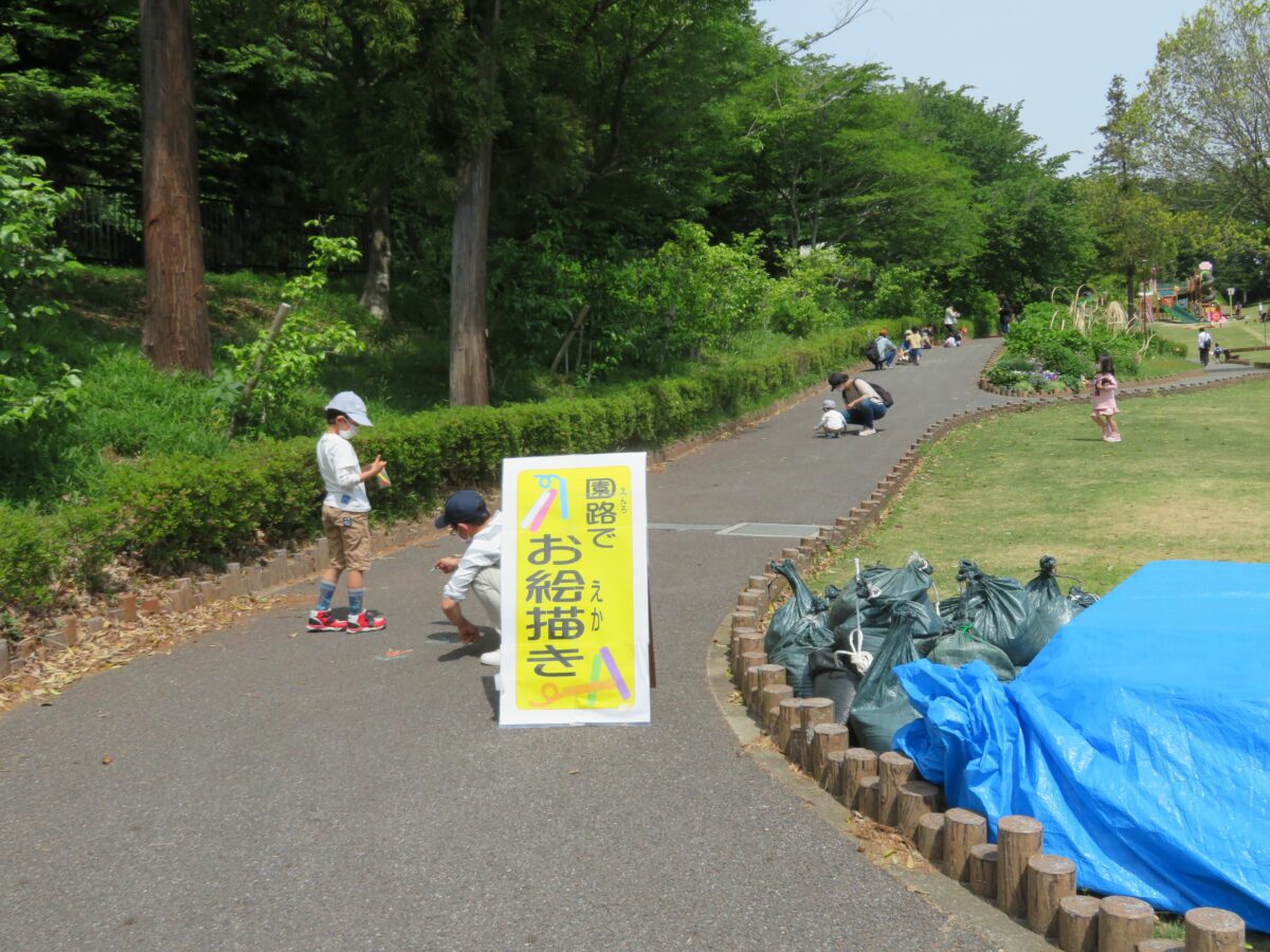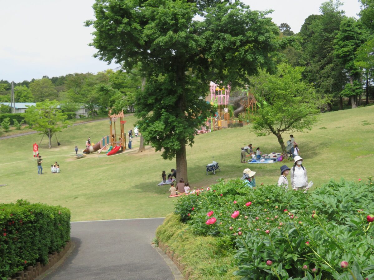 東松山ぼたん園の敷地内には大型の遊具広場が設けられ、周囲の芝生にレジャーシートを敷いてお弁当を食べることができます。遊具広場の南の園路は、「東松山ぼたん園ぼたんパークフェスタ」の期間中には「園路でお絵描き」の会場となります。