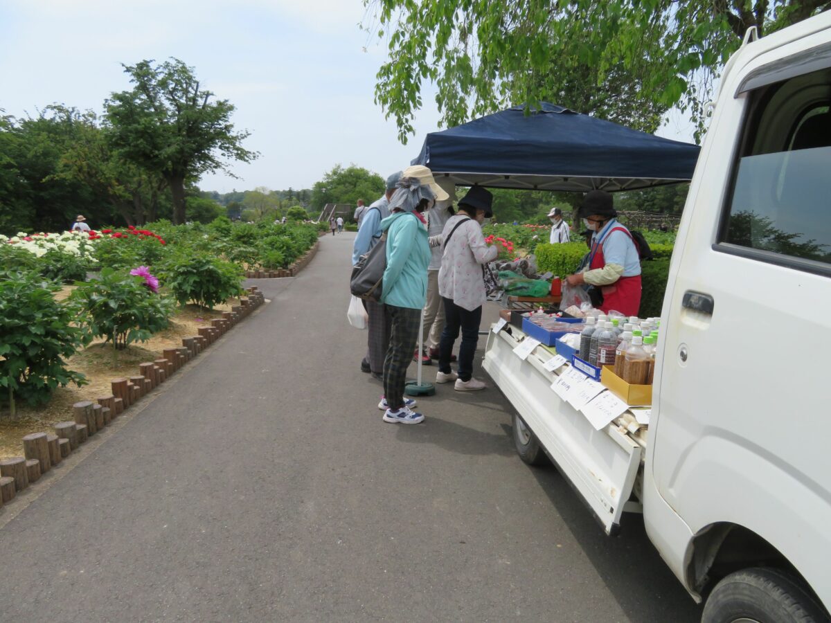 ぼたん園の北端で新鮮な野菜を販売する軽トラ市