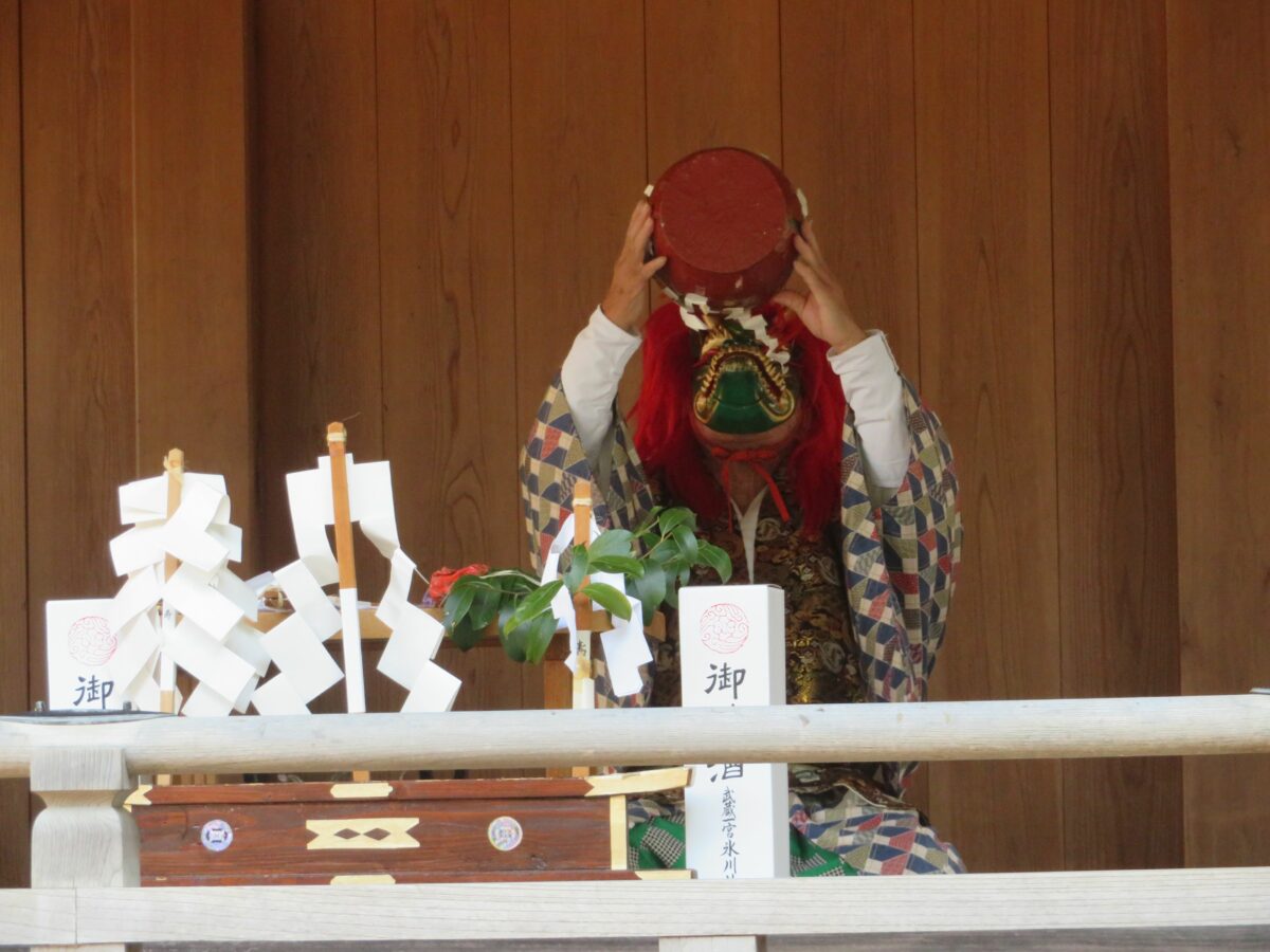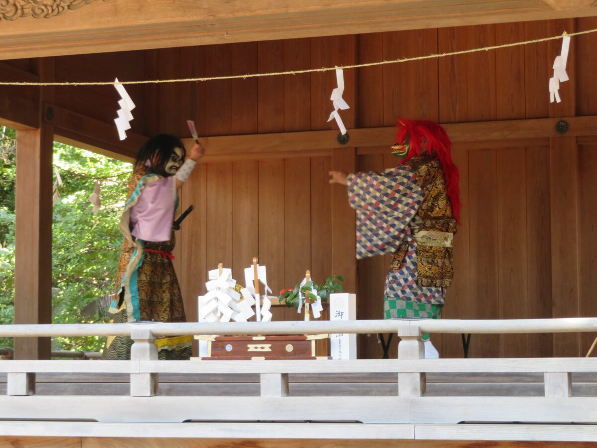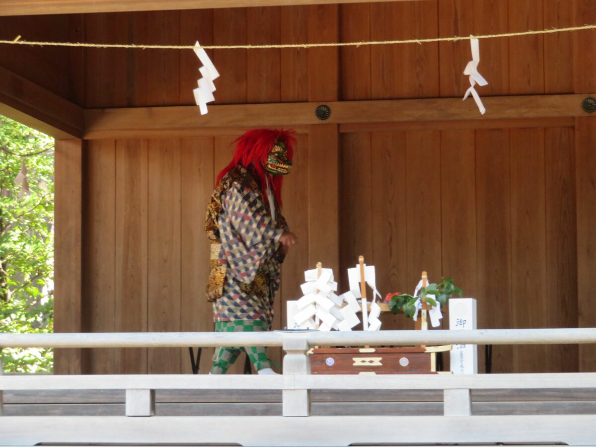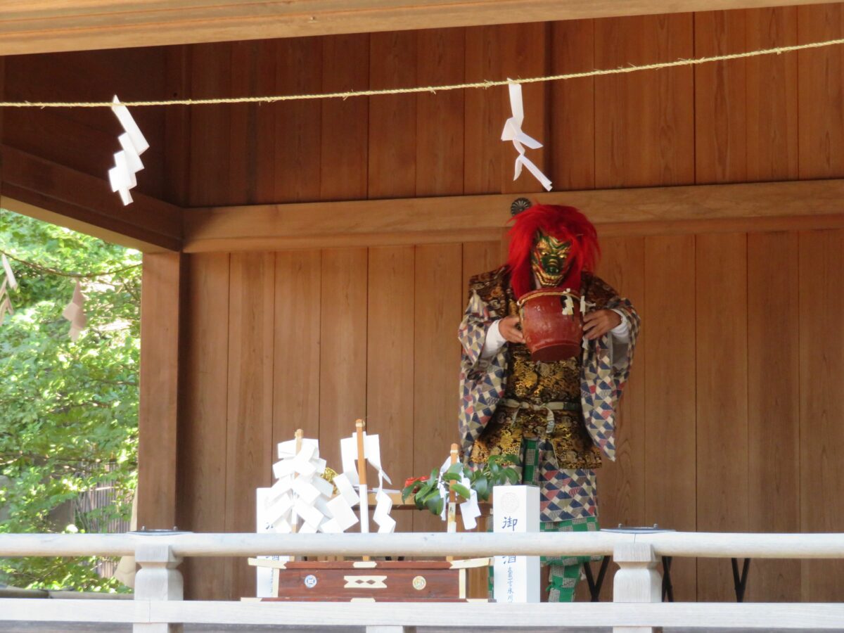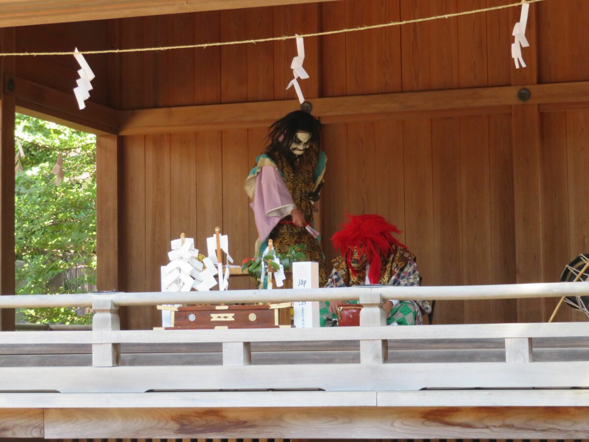 毒酒が体に回ると「八岐大蛇」は寝入ってしまいます。そこに「須佐之男命」が姿を現し、「八岐大蛇」を十拳の剣で退治します。氷川神社で主祭神として祀られる「須佐之男命」をテーマとする神楽は約30分の舞台でした。