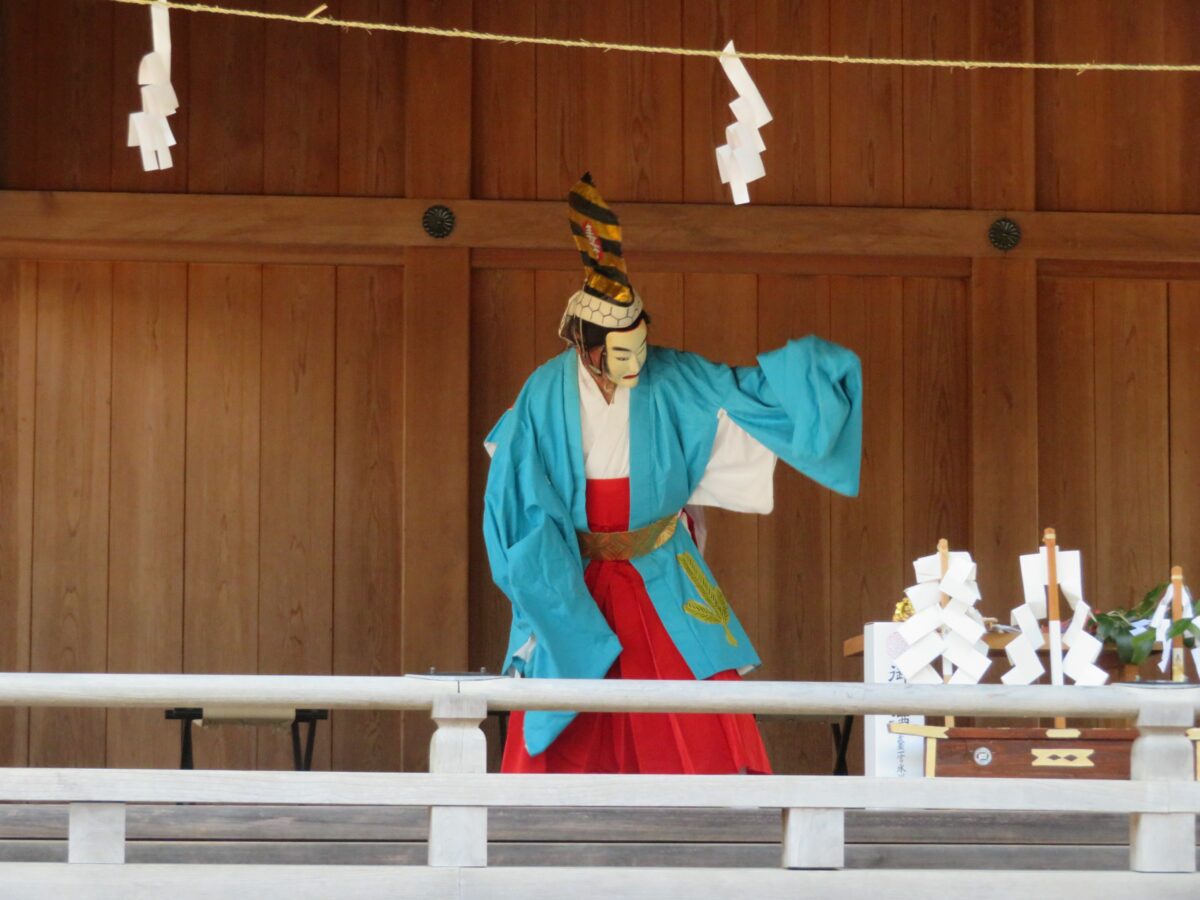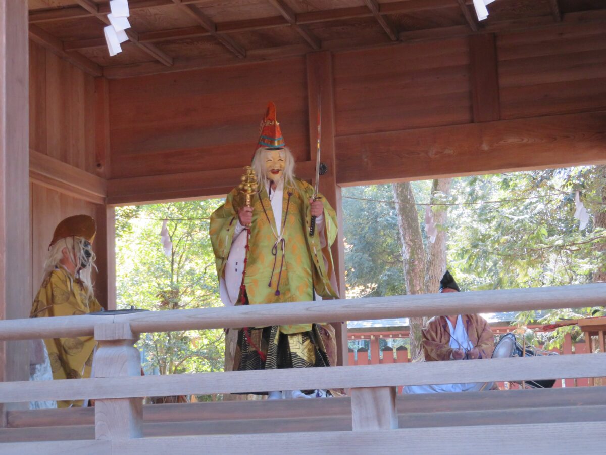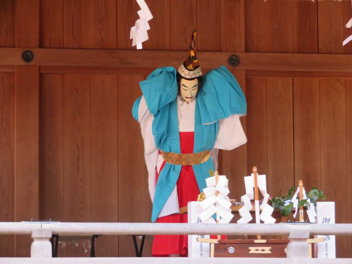 舞殿での「鈴神楽」は10分前後で終了しますが、11:00前後からは舞台を三ノ鳥居の北に設けられた神楽殿に移し、数々の演目の神楽の演舞が行われます。