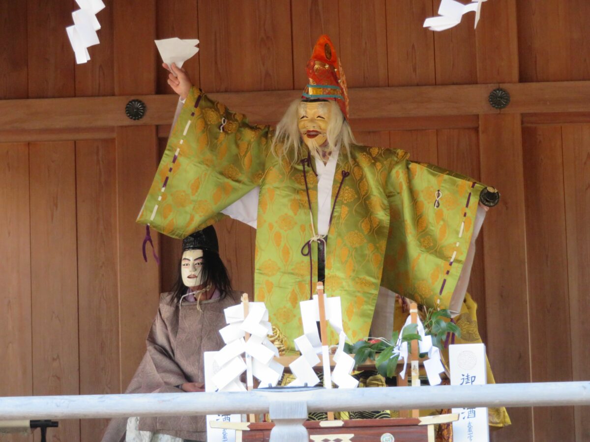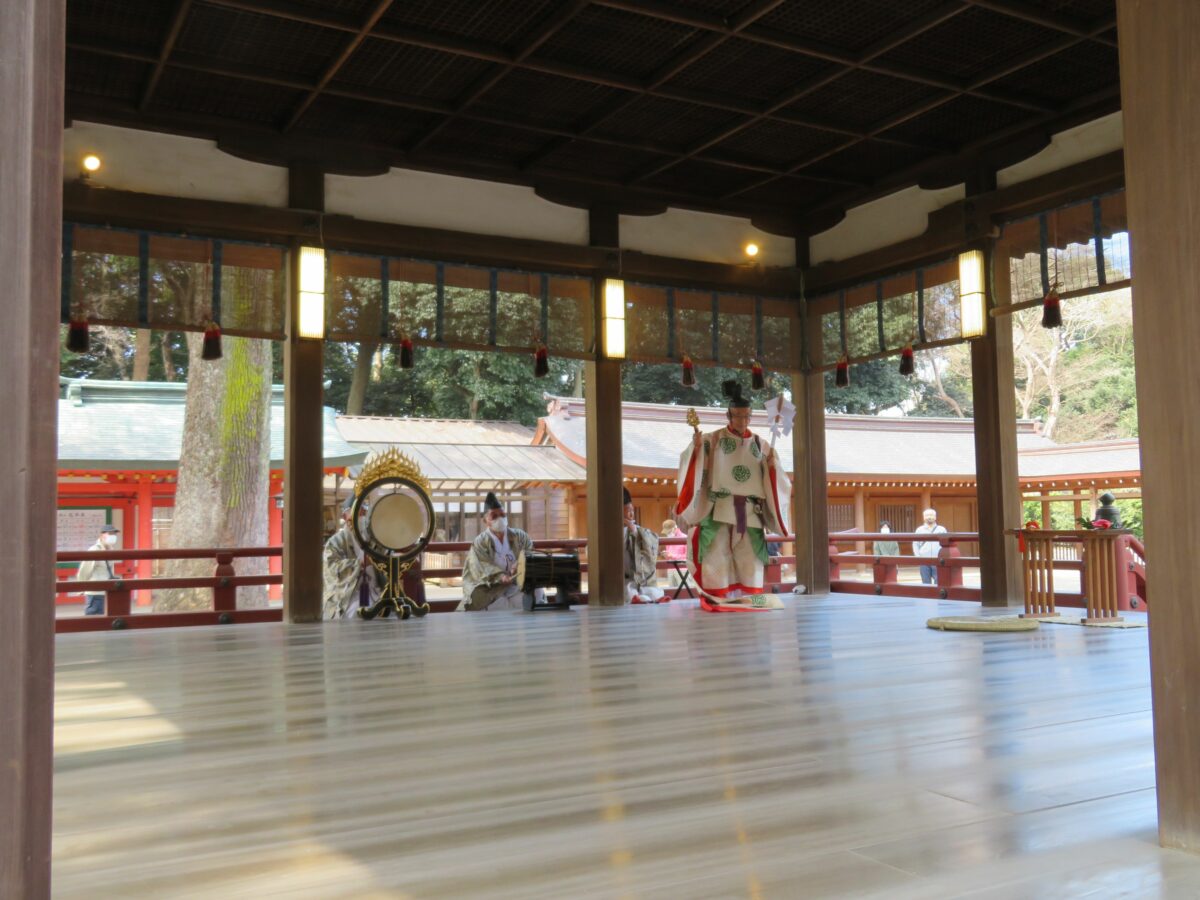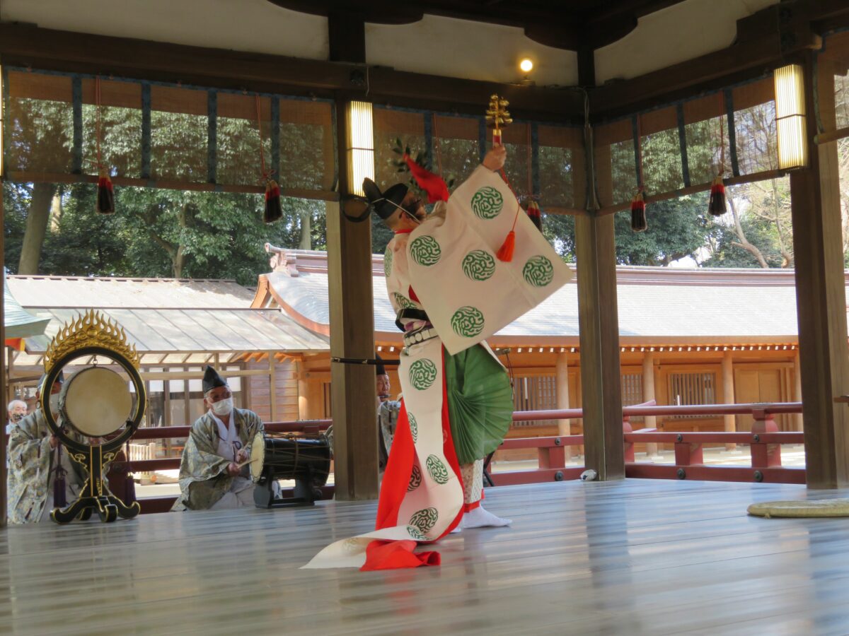 さいたま市大宮区の氷川神社では、例年3月15日に「郷神楽祭」が開催されています。2022年には、舞殿で「鈴神楽」の奉納が行われた後、神楽殿で「巫女舞」、「住吉三神」、「八岐大蛇」などの神楽の舞いが演じられました。