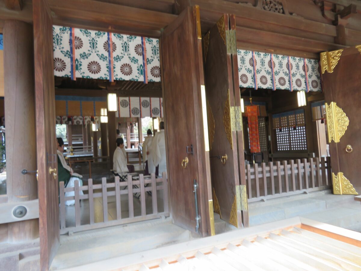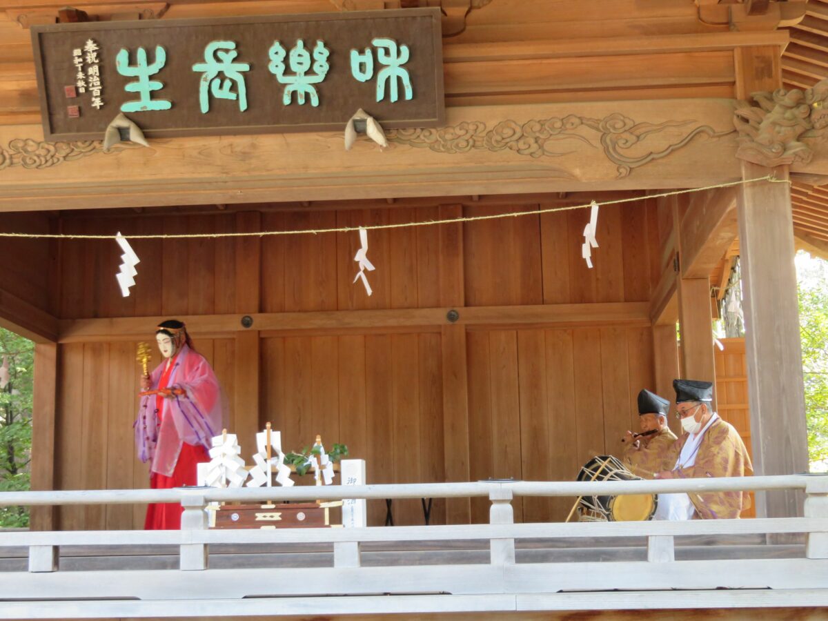 定刻になると拝殿の南に建つ舞殿で神楽の奉納が行われます。鈴を手にして舞台の隅々を移動しながら「鈴神楽」が舞われます。