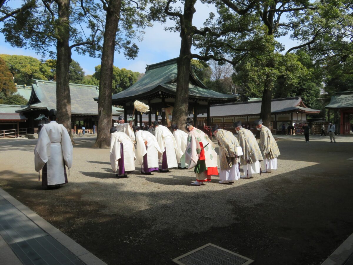 神楽は「神座(かむくら)」に神様をお迎えして行う芸能で、五穀豊穣や疫病退散などの祈りが込められます。大別すると、宮中で行われる御神楽(みかぐら)と、民間で行う里神楽(さとかぐら)の2種類の神楽があります。氷川神社の「郷神楽祭」で演じられるのは里神楽です。神楽の演舞が始まる10:00の約10分前には、境内や拝殿で神職による神事が斎行されます。
