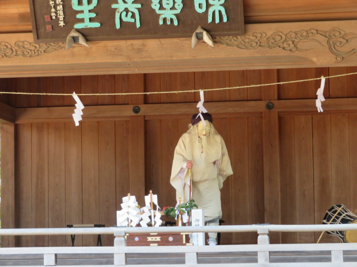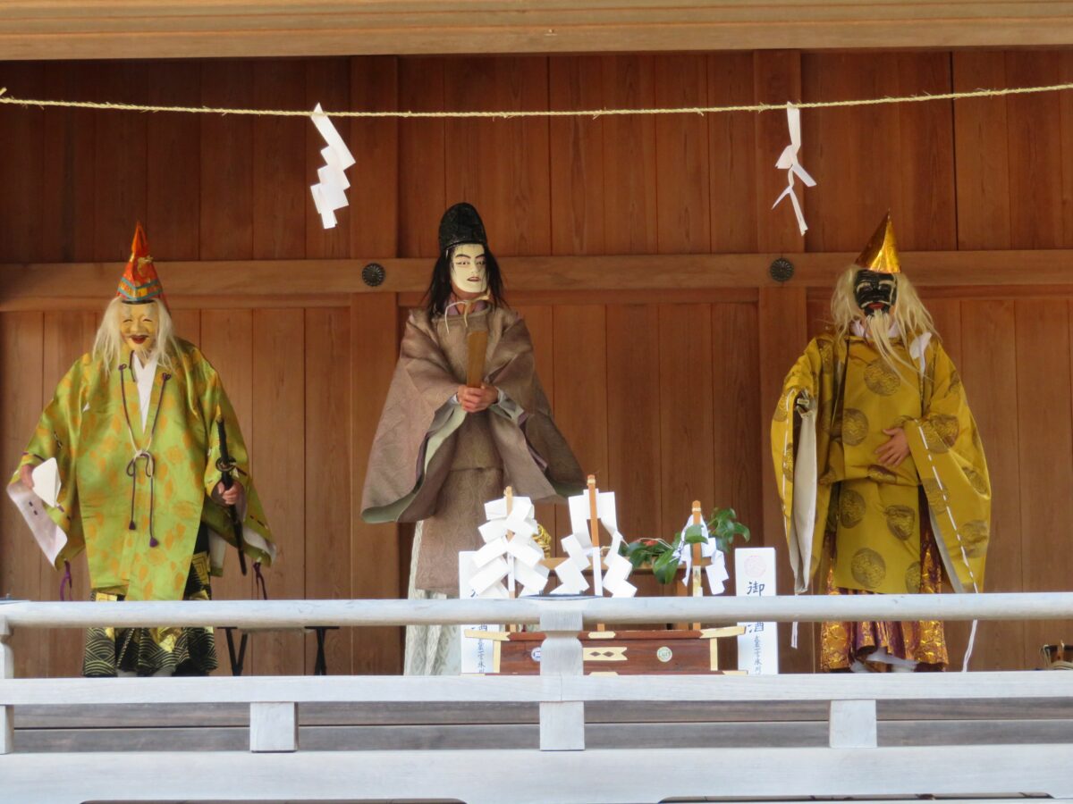 巫女に続いて順番に神楽殿で舞う「住吉三神」