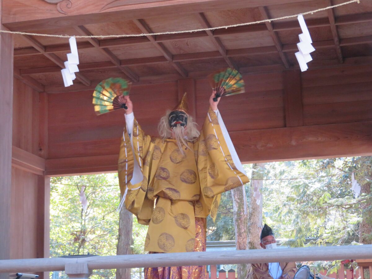 「住吉三神」によって静かな波が水面を漂うようになると「三番叟」が舞われ、五穀豊穣が祈られます。歌舞伎や文楽で演じられることも多い「三番叟」が、神楽で舞われると異なった趣を感じることができることでしょう。
