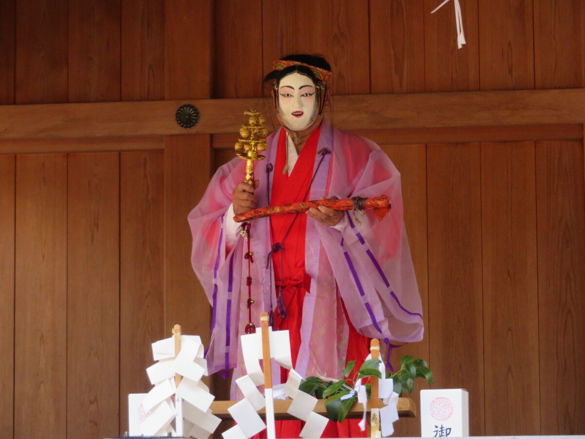 巫女に続いて舞台に姿を現すのは「住吉三神」です。海の神とされる三神は伊邪那岐命(いざなぎ)が、黄泉の国の穢を洗い清める禊を行ったときに産まれました。水表に「上筒之男神(うわつつのおのみこと)」、瀬の流れの中間に「中筒之男神(なかつつのおのみこと)」、瀬の深い所に「底筒之男命(そこつつのおのみこと)」が誕生しました。