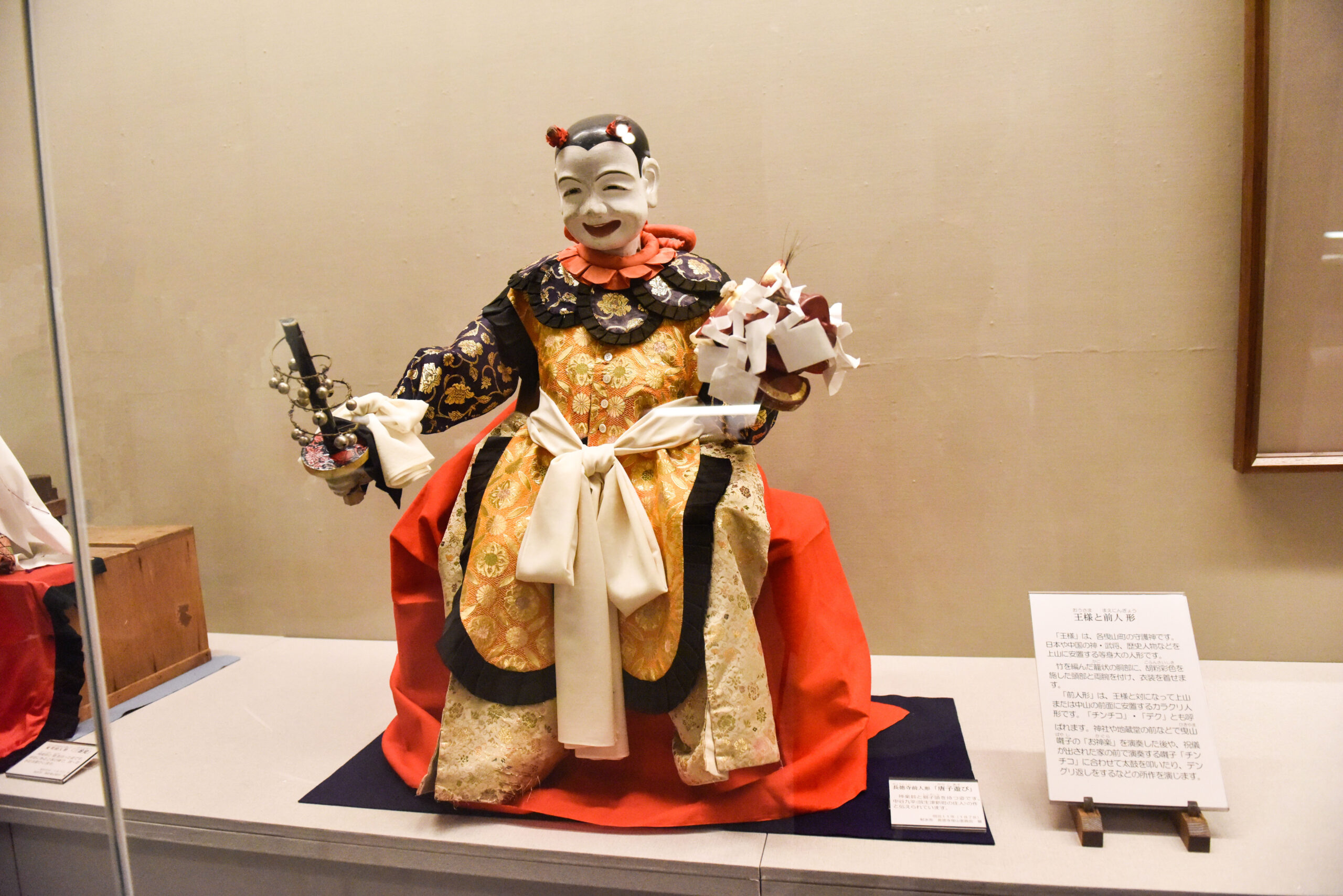 また、曳山に取り付けられる前人形の展示もあった。前人形は神社や地蔵堂で演奏される曳山囃子のお神楽や、ご祝儀が出された家の前で演奏される囃子「チンチコ」に合わせて、太鼓を叩くなどの所作を演じる。普段は曳山に登る担い手でないと近くから眺めることもないため、じっくりと拝見することができて良かった。