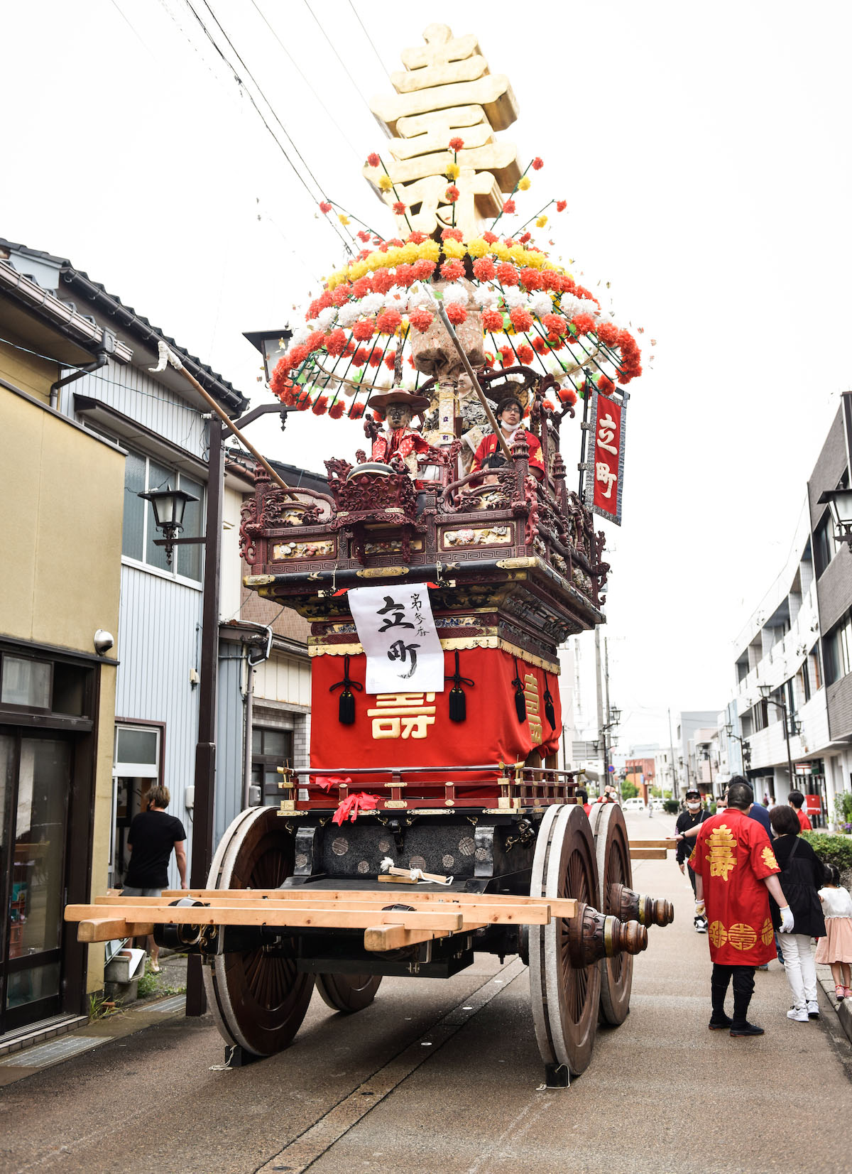 立町の曳山の担い手の1人にお話を伺ってみたところ、「立町の曳山の歴史は江戸時代に曳山が始まって以来、今年で300年になる。上山という曳山の上段に当たる部分は300年取り替えなしで、鏡板は1803年制作と古い。上から下まで全部変えれば漆が一番高くて2~3億円はかかる。車輪はとりわけ大きいため、一木で材料を確保できるところはなかなかない」とのこと。