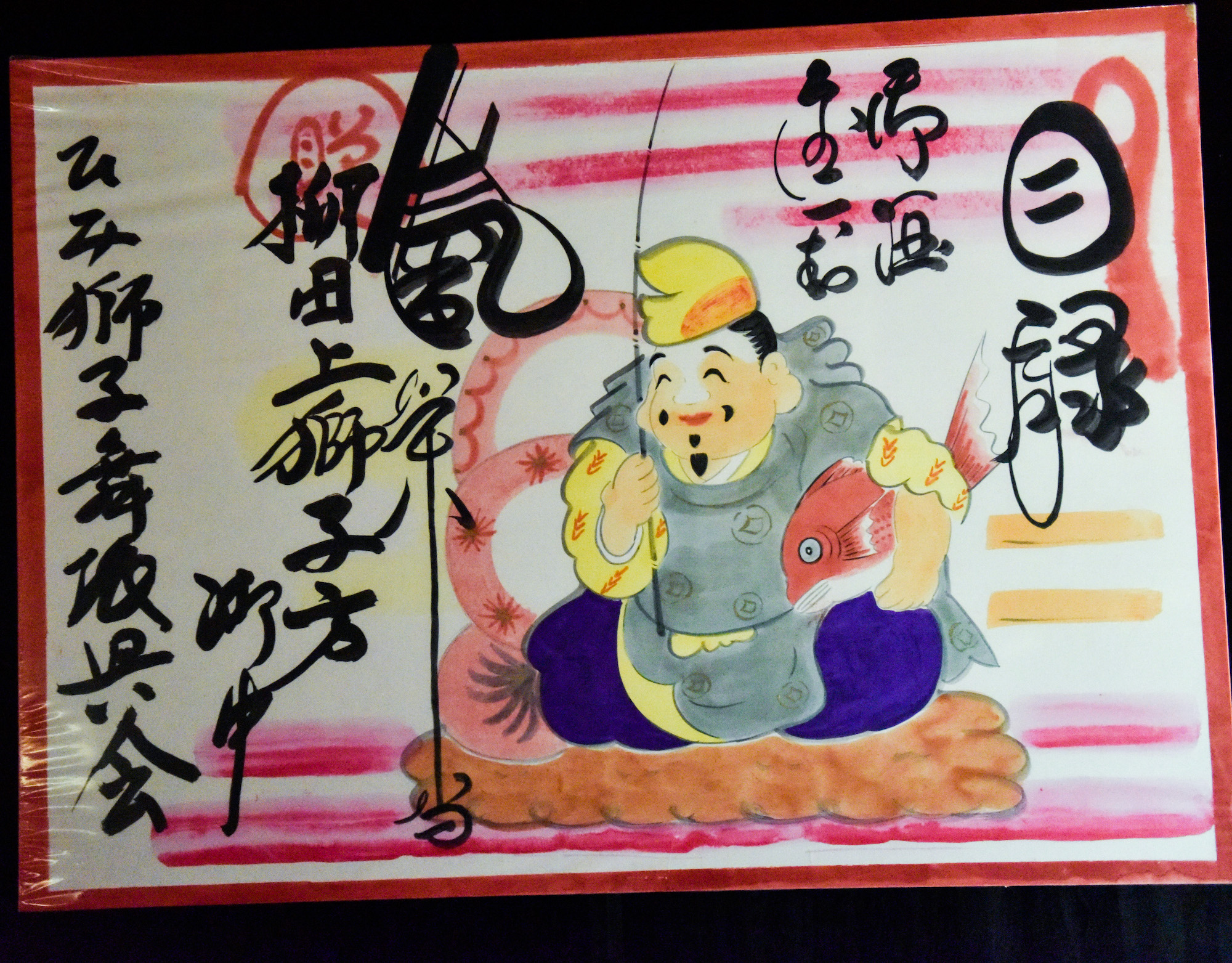 こちらは獅子舞の実演をしてくれた団体が納めていった祝儀を書き記した目録のイラストだ。このようなものがたくさん壁に飾られていた。えびす様のほのぼのとした表情がとても素晴らしい。筆の柔らかいタッチと、鮮やかな色遣いがとても賑やかな雰囲気だ。有名人が色紙に記したサインを眺めているような感覚で、じっくりと眺めた。
