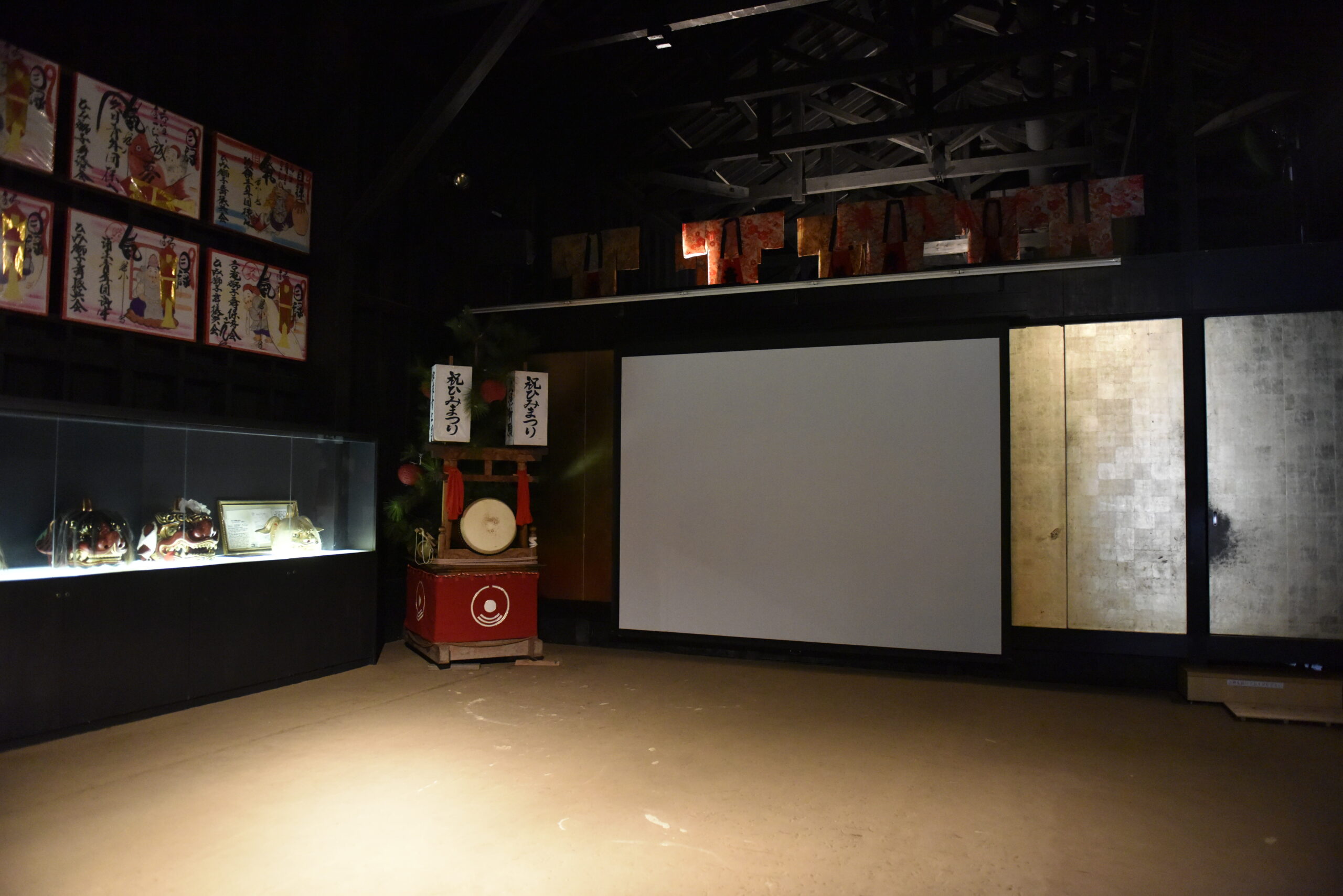 スクリーンの横にある太鼓台について、スタッフの方から興味深いお話を聞いた。太鼓台には鳥居が取り付けられており、太鼓の上には神様がいるという意識があるらしい。つまり、太鼓台を移動させることは、神社が移動していくような感覚なのだ。鳥居を頂いた太鼓はまるで、神社にある鏡のようにも思えてくる。
