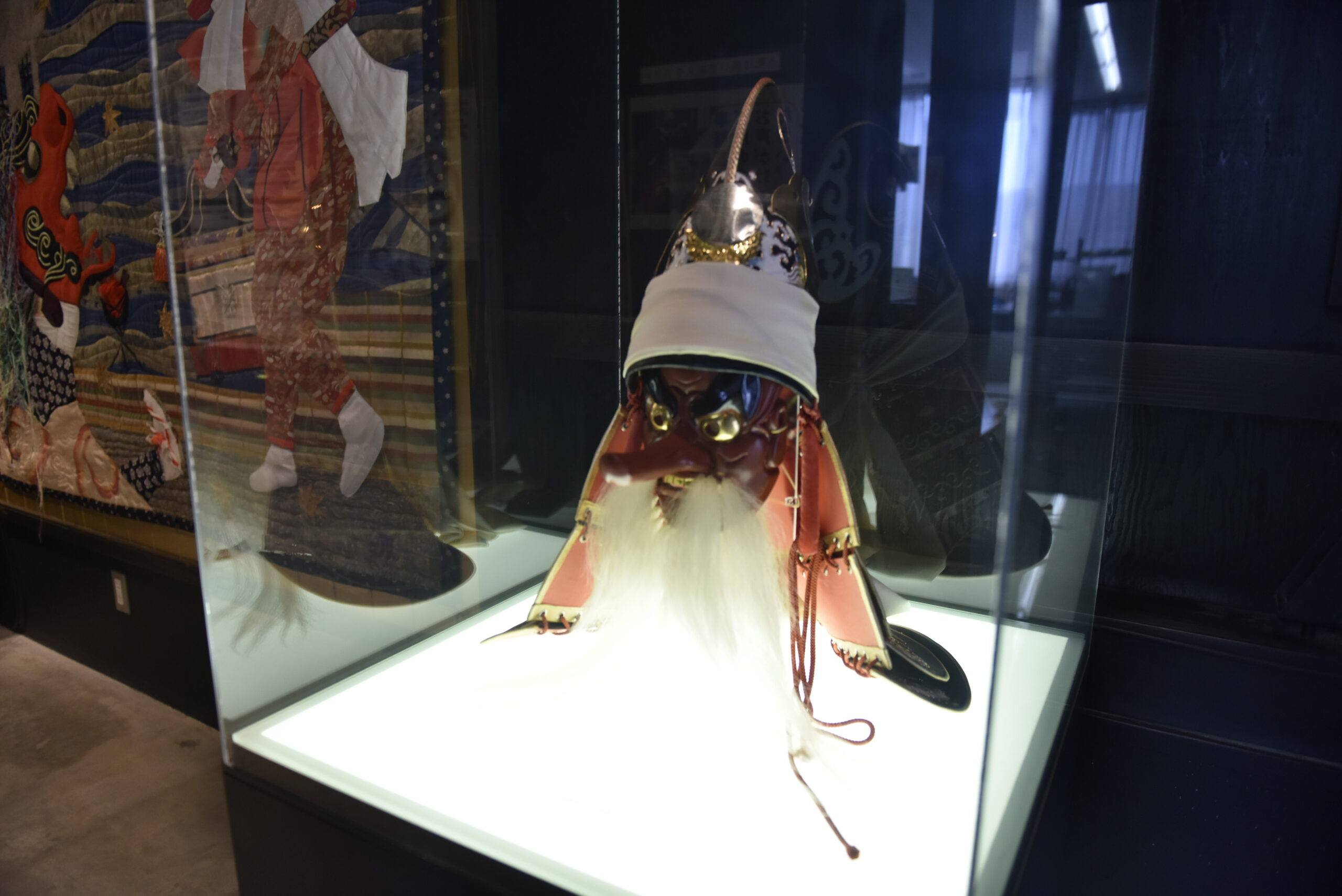 少し照明が暗くなっているので、下から照らされた天狗面が神秘的に見えてくる。天狗面が被っている烏帽子は、その模様が1つ1つ違っているので、ぜひ注目していただきたい。例えば、江戸時代に富山県を統治していた加賀藩の梅鉢紋が付いているものもある。