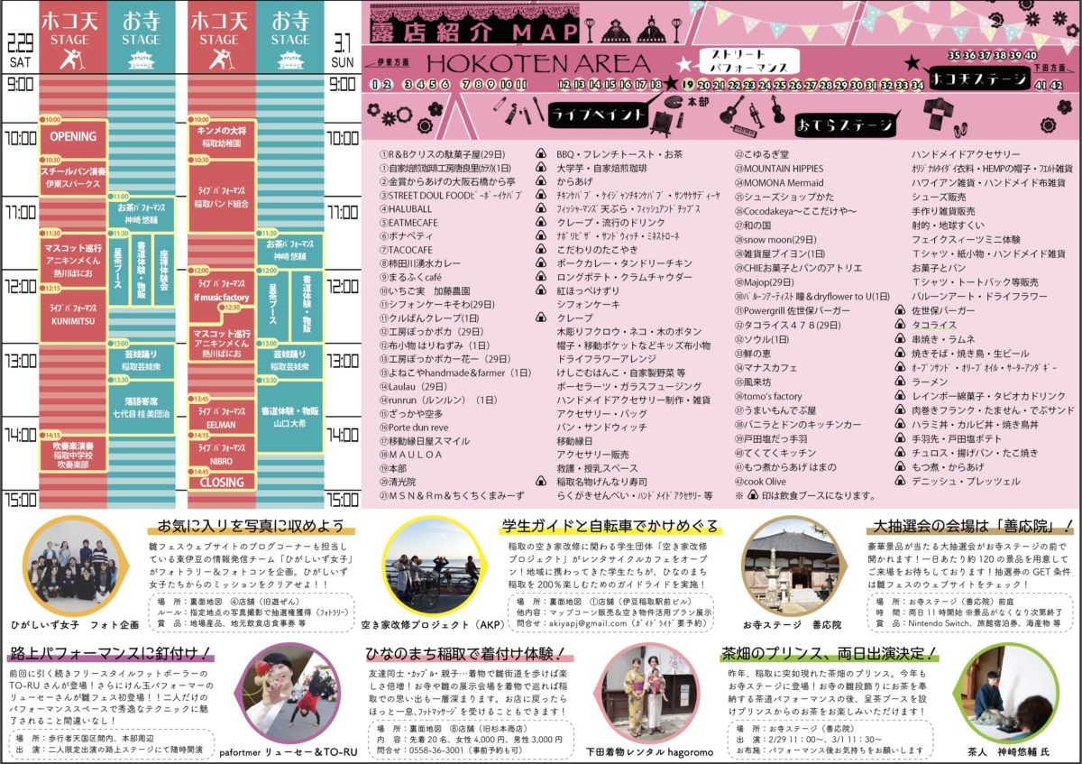 地元のご当地キャラ、伊豆出身のミュージシャン、地元稲取や伊豆で活動するバント、地元バントと「元ミス雛のつるし飾り」高瀬 真由さんとのコラボ、地元幼稚園児によるダンス、フリースタイルフットボーラーや大道芸など、音楽やカルチャー満載のストリートイベントである。
