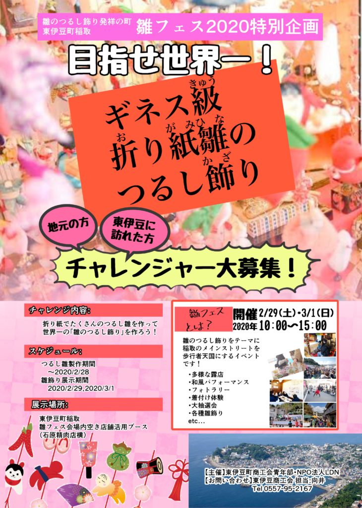 雛のつるし飾り発祥の地「稲取」ならではの企画盛り沢山のイベント「雛フェス2020」が2020年2月29日(土)、3月1日(日)の2日間、伊豆稲取にて開催される。伊豆稲取のメインストリートが歩行者天国になる。「雛フェス2020」は静岡県東伊豆町商工会青年部が、NPO法人ローカルデザインネットワークと協力し開催するもの。