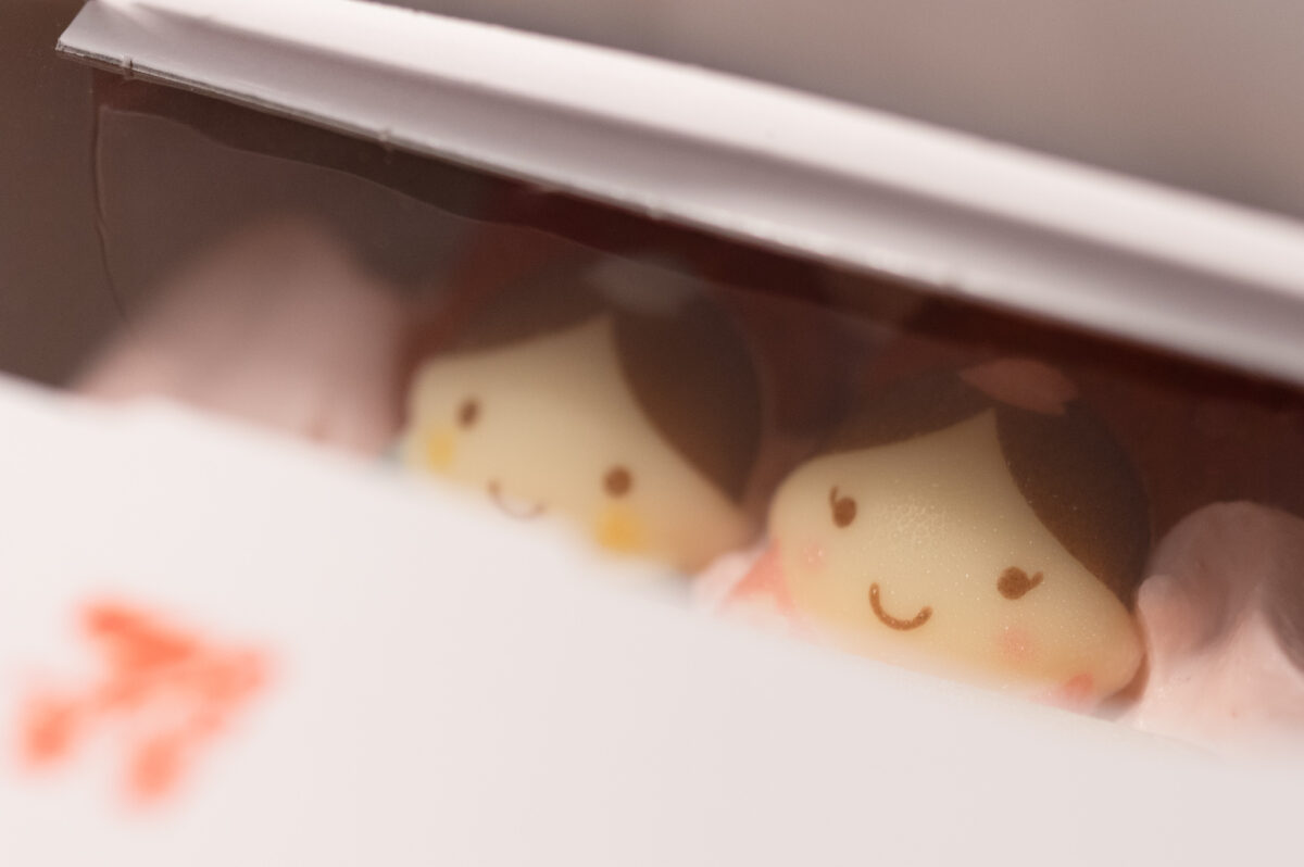 たっぷりのホイップクリームで覆われたケーキの天面には、ホワイトチョコレートでできた男雛と女雛、いちご(2個)、いちごクリーム、「ひなまつり」とかかれたプレートで飾り付け。こちらのプレートもホワイトチョコレートでできています。