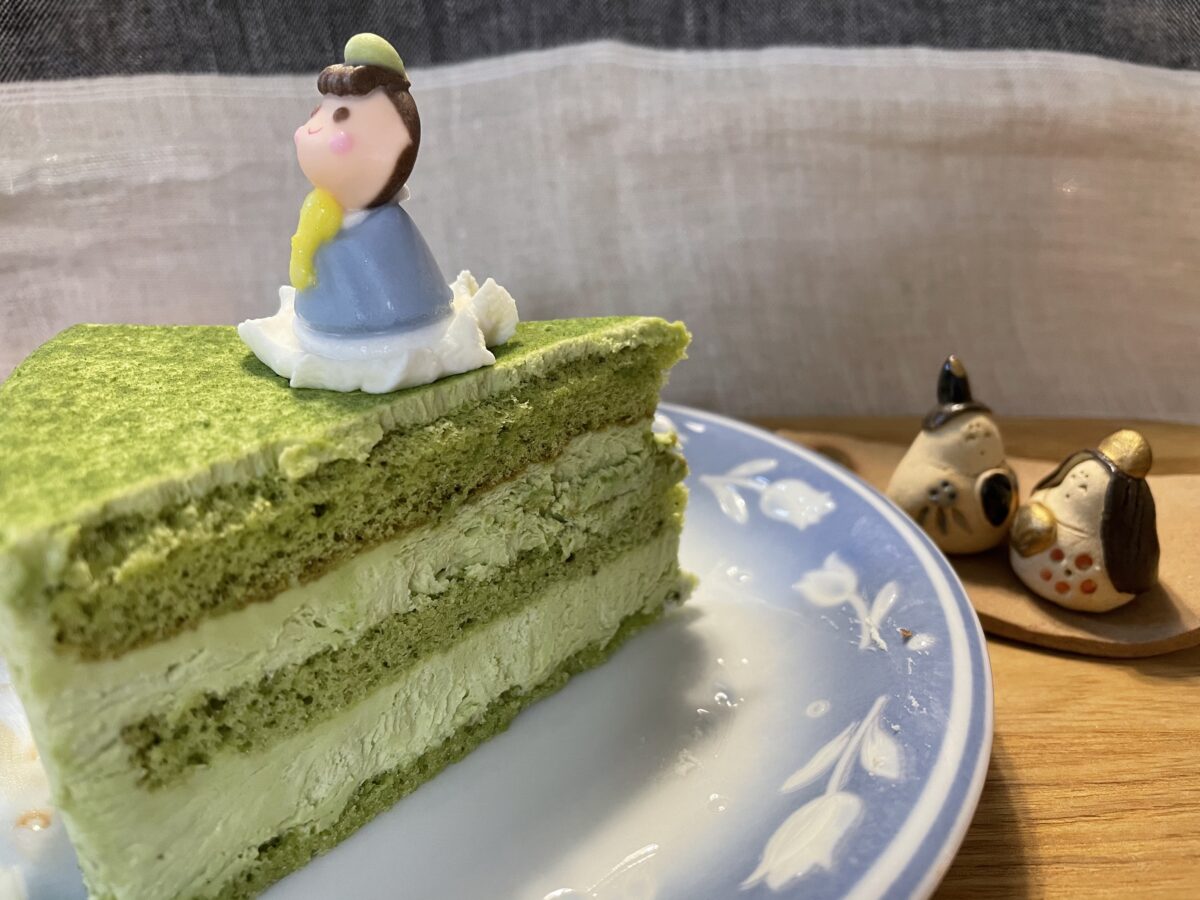 スポンジからクリームまで抹茶尽くしのほろ苦いケーキ。抹茶のほろ苦さを感じるので甘いものが苦手な方にもオススメ!もちろん、お内裏様も食べられますよ!
