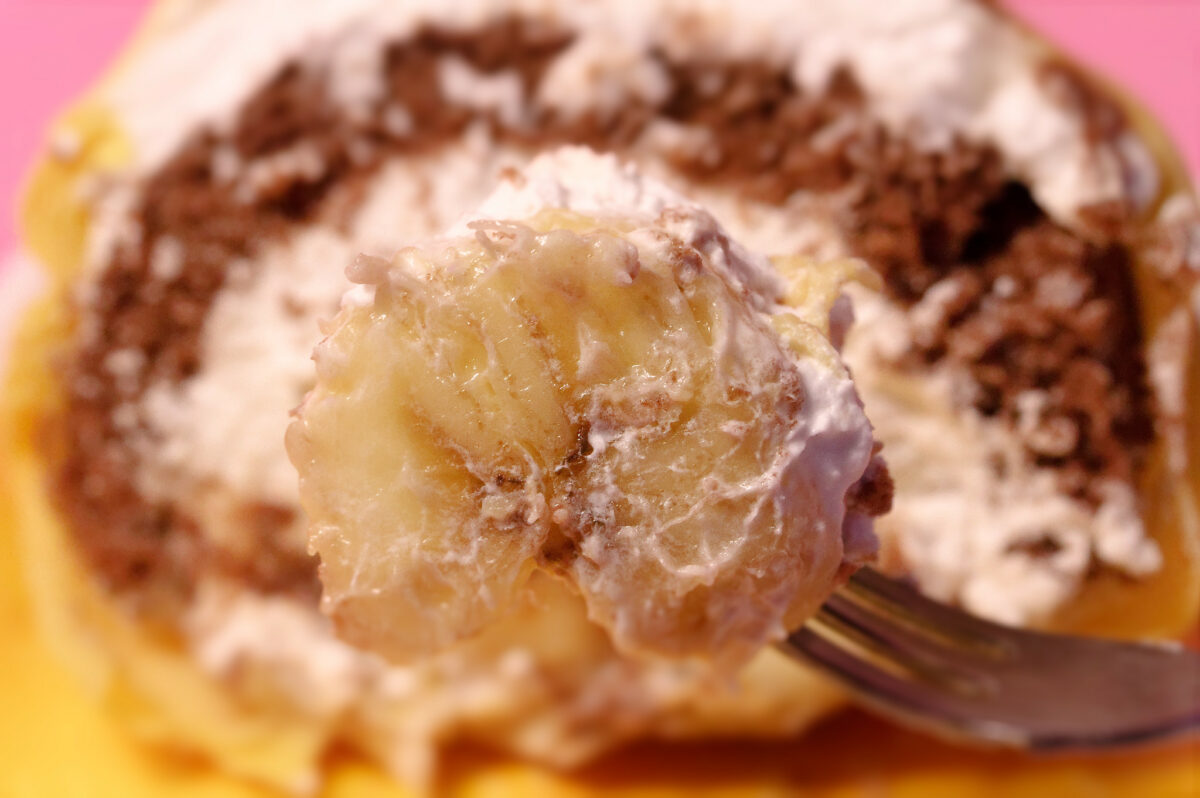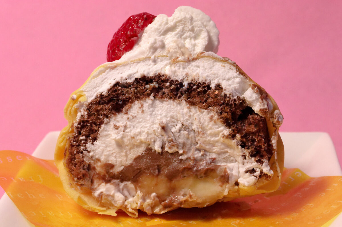 半分に切ってみると、断面はこんな感じ。ココアスポンジとたっぷりのクリーム、チョコレートソース、バナナが薄手のクレープ生地で包まれています。