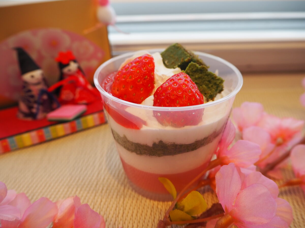 ひなまつりの菱餅を思わせる3色が層をなしており、とても彩り豊かなパフェです。