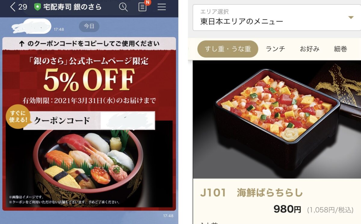 (左)LINEの友だち登録で届くクーポン画面。(右)スマートフォンの注文画面