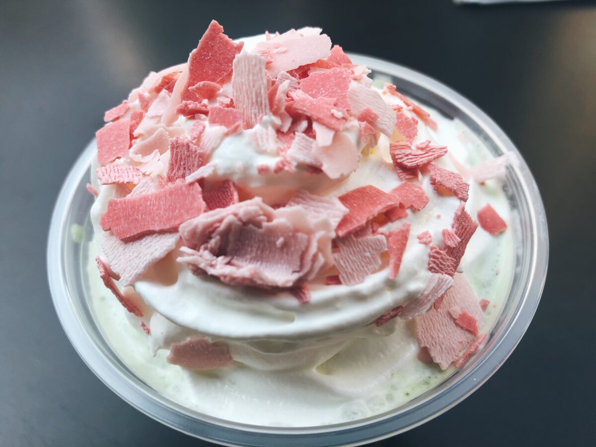 そのままオーダーするとチョコレートソースがかかるのですが、3色の色味を際立たせるために、今回はレジでオーダーの際に「ソースはなしで、桜のチョコだけたっぷりかけて」とお願いしました◎