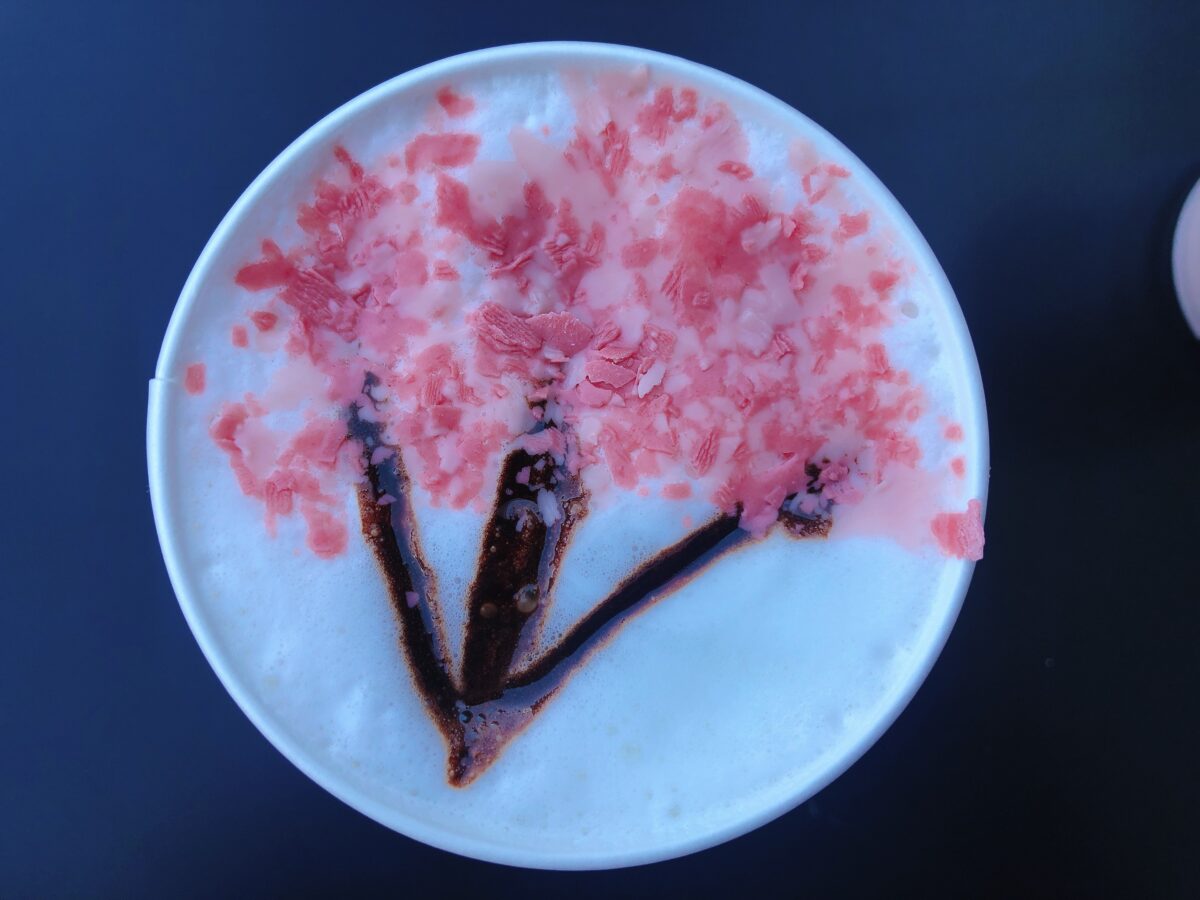 「桜さいたミルクラテ」には満開のさくらデザイン!このトッピングを55円でほかのドリンクに使えることを利用します。