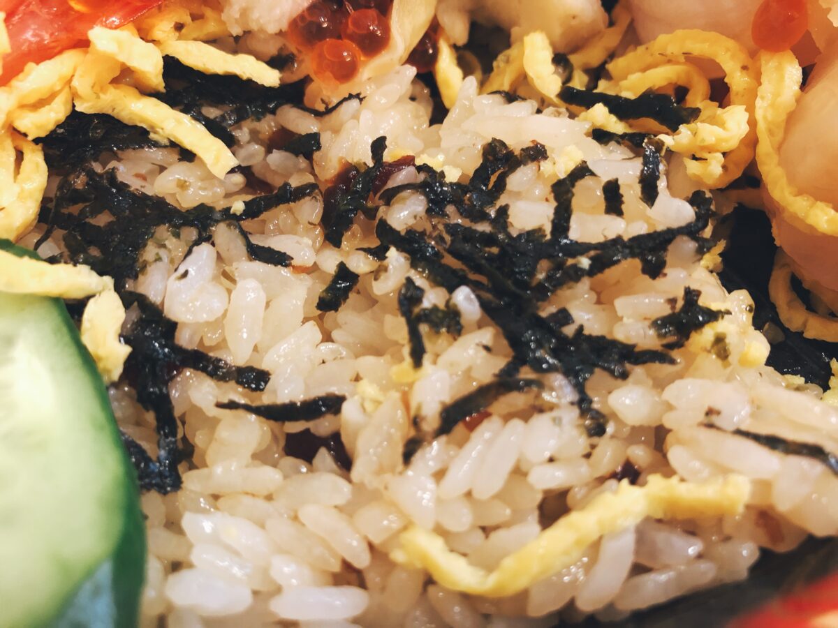 ちらし寿司とは思えないほど一つ一つのネタが大きめで贅沢な印象です。ほたてはトゥルトゥルもちもちの食感、2種類のエビはふっくら&プリプリ、ふっくらした穴子にはタレがついておらず、他の具材との調和が取れていておいしかったです。