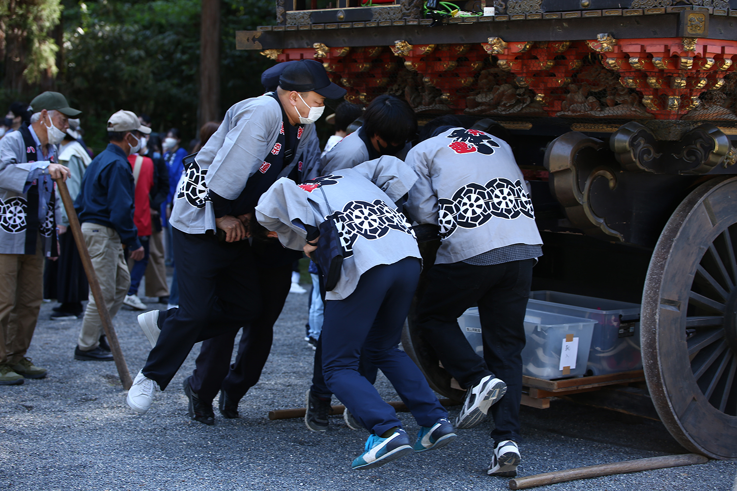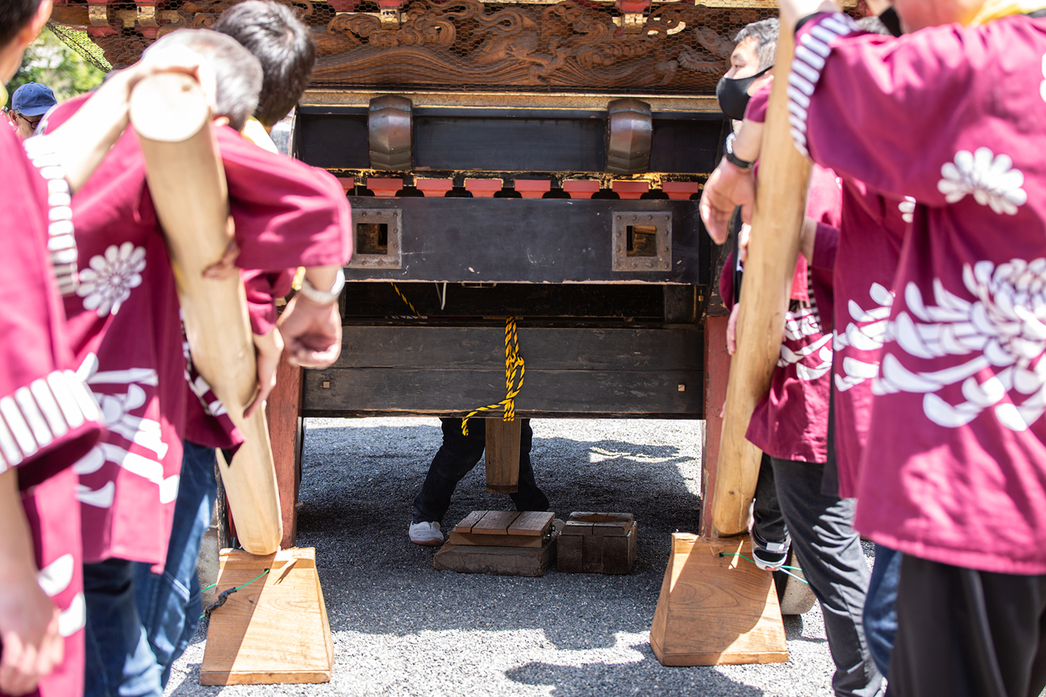 ギンギリ回しでは曳山に長い棒を差し込み、「てこの原理」を使います。曳山の下に人が入り芯棒の下にぶ厚い板をセット。車輪を浮かせ、力技で曳山を方向転換をします。