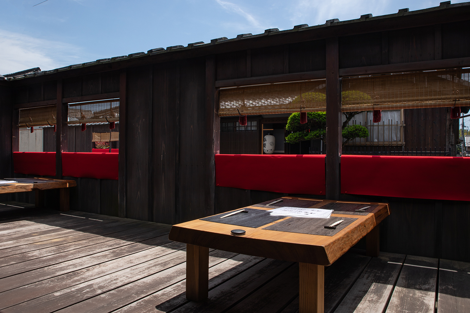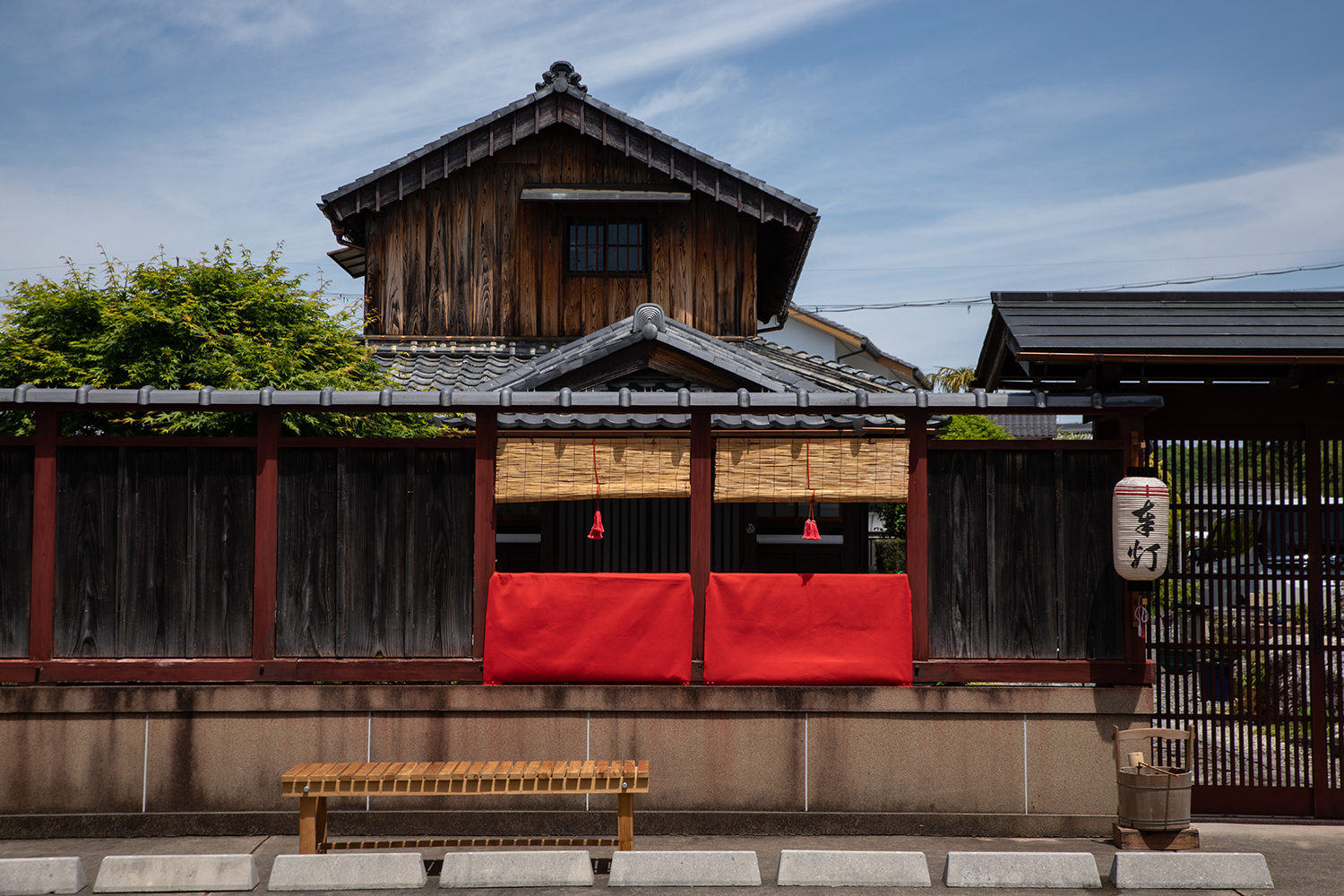 日野の町中でよく見る光景、この赤い毛氈(もうせん)で飾りつけた「桟敷窓」は日野祭の曳山をみるために作られたものです。