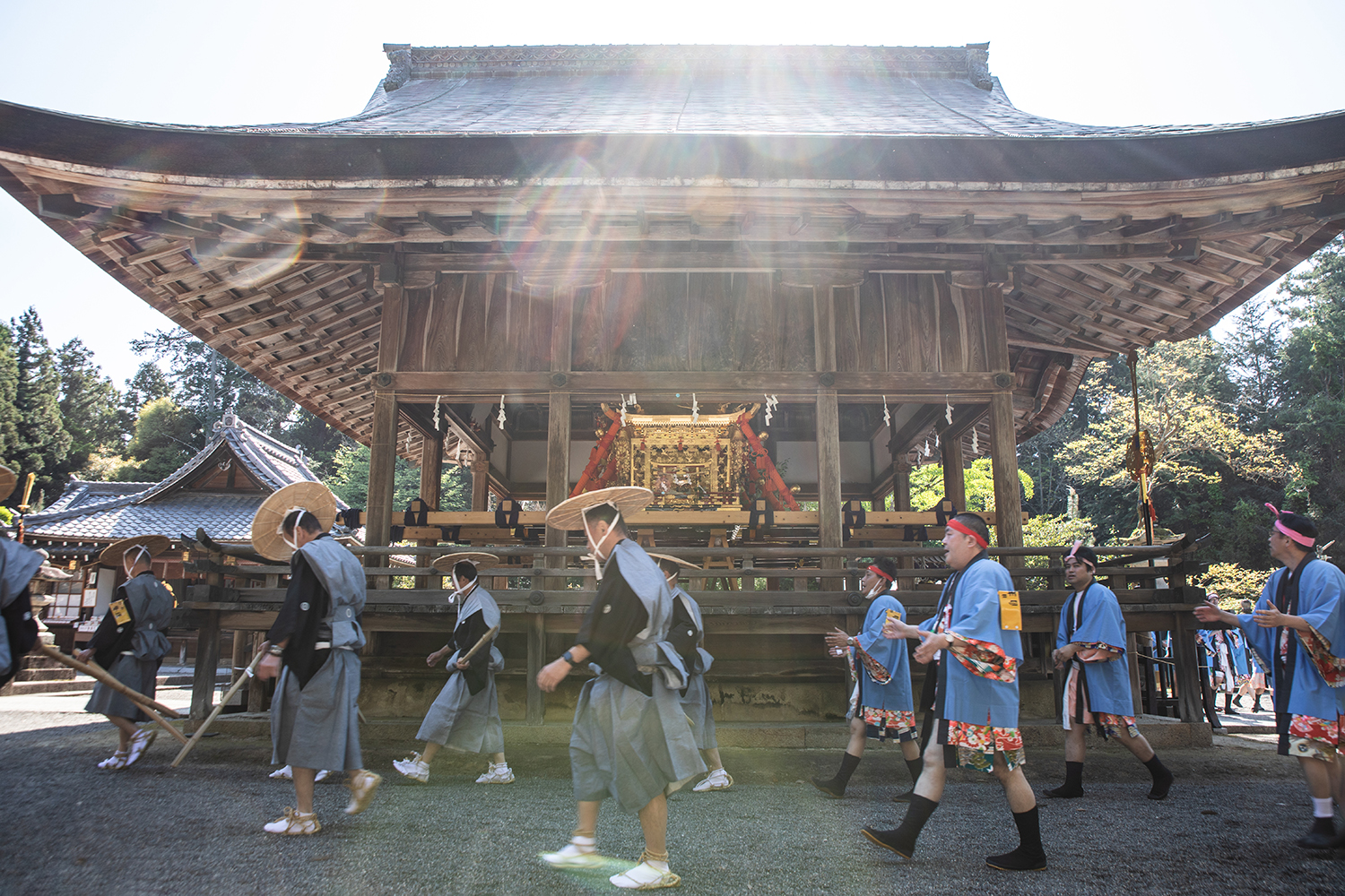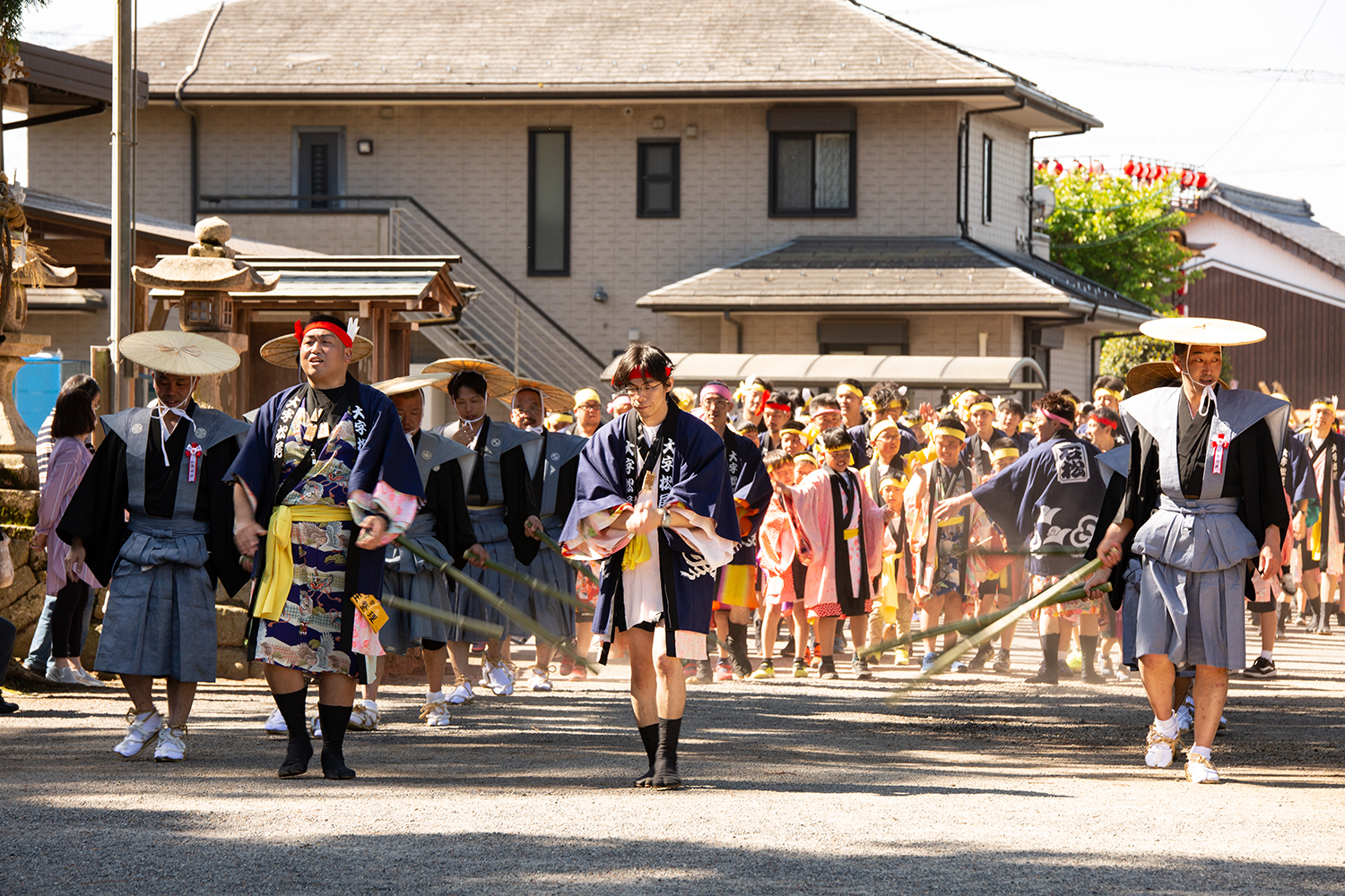 太鼓の音に導かれて神社に近づくと、裃を着た人たちが先が割れた竹刀「バンバラ竹」を地面に打ち付け、音を鳴らしたり、神輿駕丁たちが「ヤレヤレ!」「ドントヤレ!」と手を叩きながら宮入りしていました。おぉ〜、いつもの静かな境内と全然違う!とワクワクします。